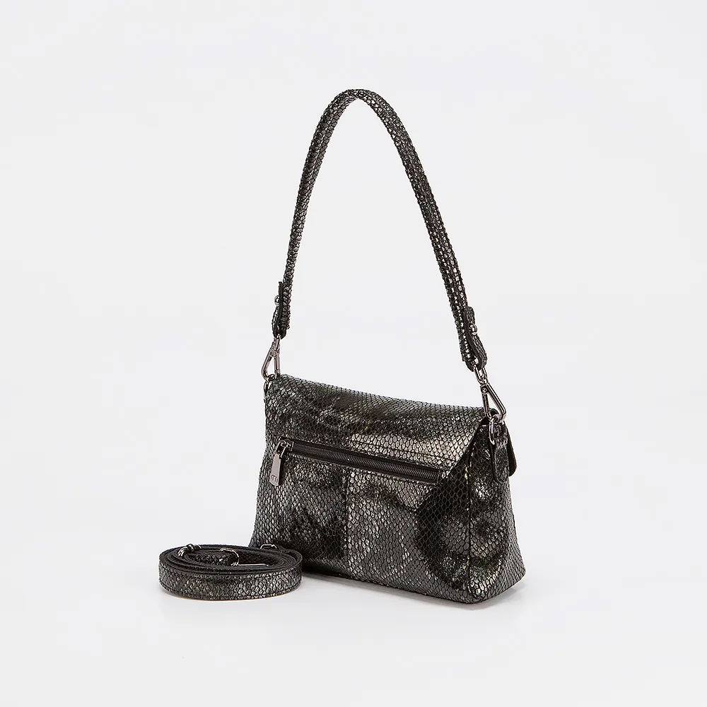 Сумка от торговой марки Poshete выполнена из натуральной кожи серого цвета с лазерной обработкой и тиснением под рептилию. Модель с длинной ручкой и съемным регулируемым плечевым ремнем. Клапан на магнитной кнопке закрывает отделение на молнии. Внутри: текстильная подкладка, карман и средник на молнии, накладной карман. На задней стороне - карман на молнии.
