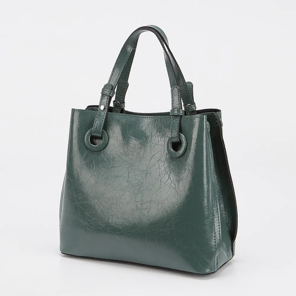 Сумка от торговой марки Poshete из натуральной кожи зеленого цвета с эффектом pull up. Компактная модель с двумя ручками и съемным регулируемым плечевым ремнем. Три отделения с частичной подкладкой, крайние фиксируются магнитной кнопкой. Среднее отделение на молнии, внутри: карман на молнии, два накладных кармана. Дно оснащено ножками для защиты от износа.