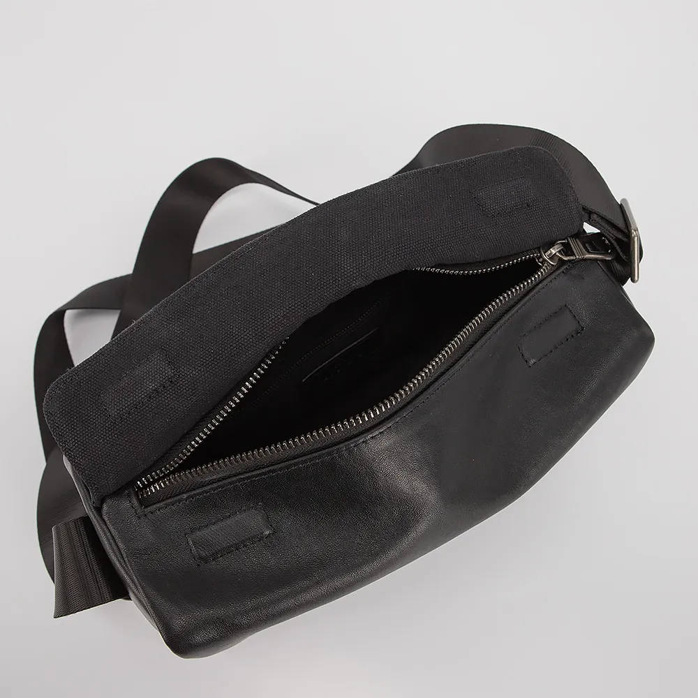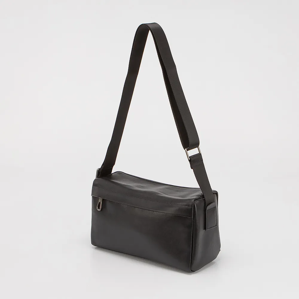 Сумка от торговой марки Poshete выполнена из натуральной кожи черного цвета. Модель с длинным регулируемым широким плечевым ремнем из текстильного материала. Небольшой клапан на скрытых магнитах закрывает отделение на молнии. Внутри: текстильная подкладка, карман на молнии, накладной карман. На задней стороне - карман на молнии.