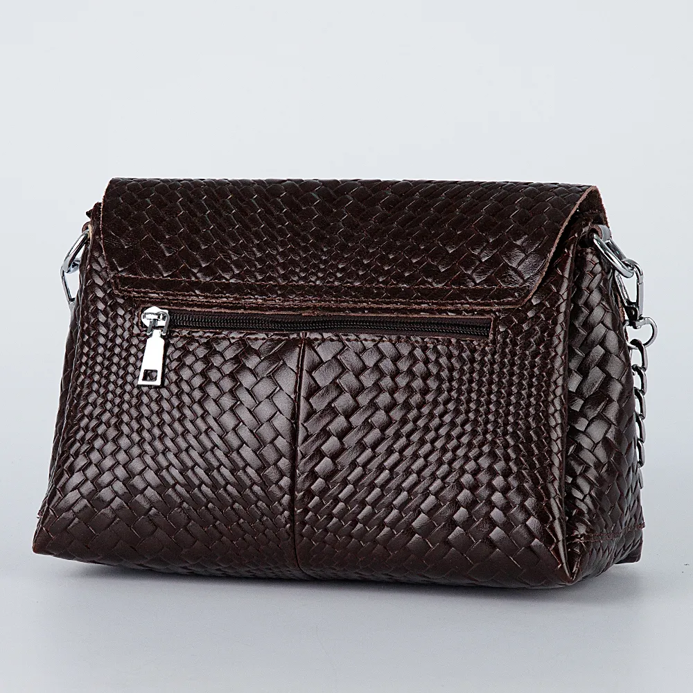 Сумка от торговой марки Poshete выполнена из натуральной кожи темно-коричневого цвета с тиснением под плетение. Модель с ручкой в виде ремешка с цепочкой и съемным регулируемым плечевым ремнем. Закрывается клапаном на магнитной кнопке. Молния закрывает отделения, в среднем – карман на молнии и два накладных кармана. На задней стороне – карман на молнии.