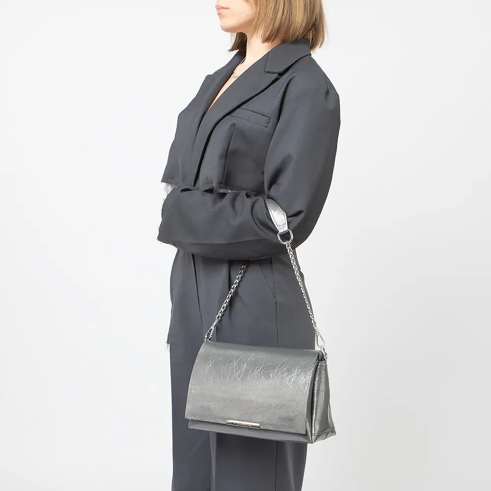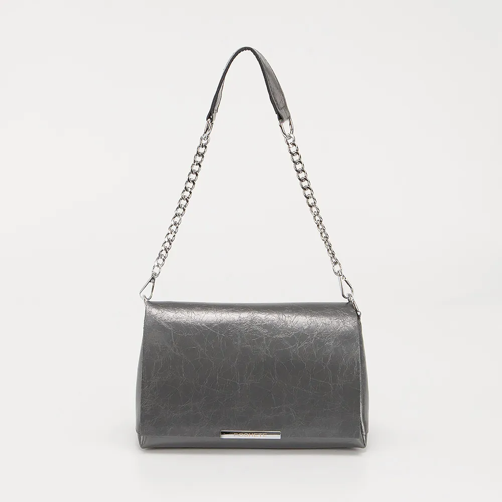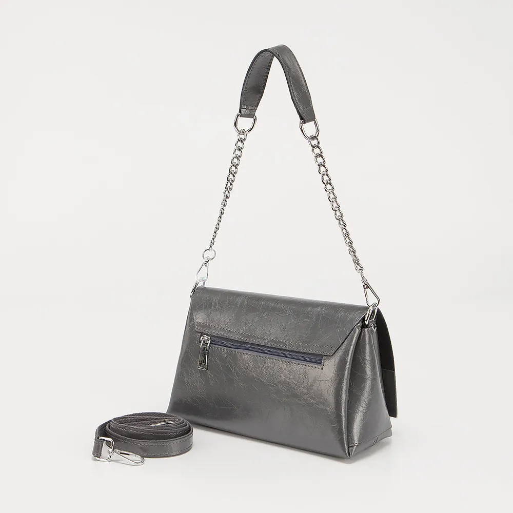 Сумка от торговой марки Poshete из натуральной кожи серого цвета. Модель со съемной ручкой-цепочкой и съемным регулируемым плечевым ремнем. Клапан на магнитных кнопках закрывает отделение на молнии с фирменной подкладкой. Внутри: три отсека. На задней стороне - карман на молнии.
