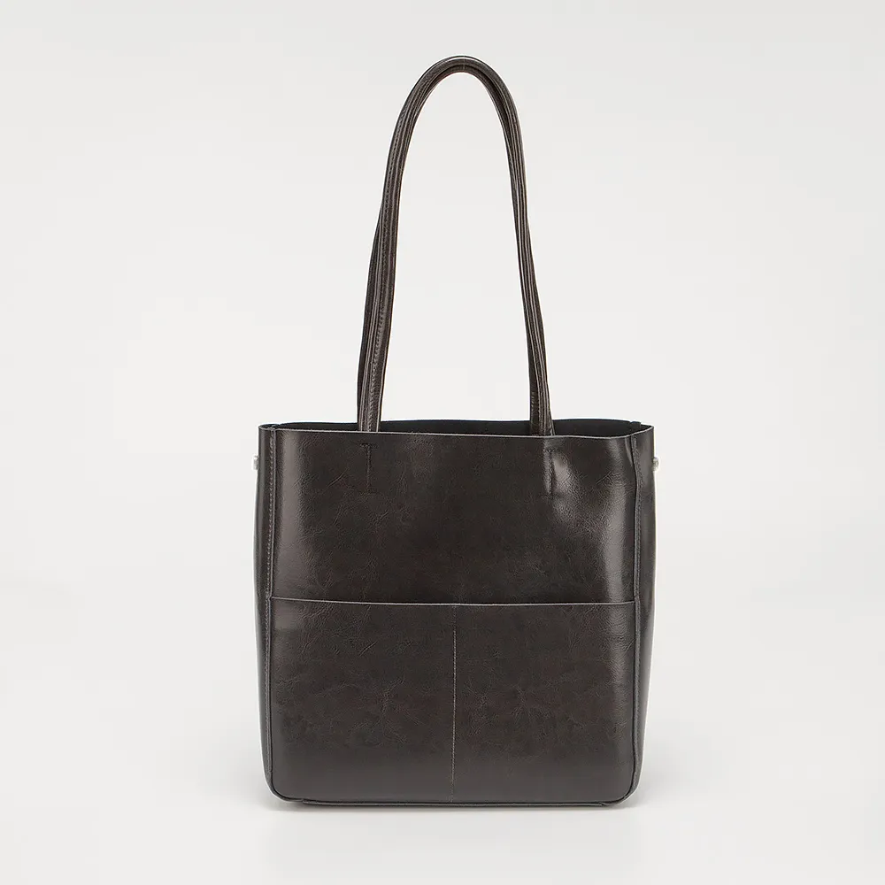 Сумка от торговой марки Poshete из натуральной кожи серого цвета. Модель шоппер с удлиненными ручками. Отделение на молнии. Внутри: фирменная подкладка, средник и карман на молнии, накладной карман. На лицевой и задней сторонах - по два накладных кармана без застежки.