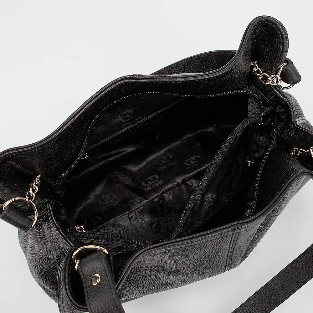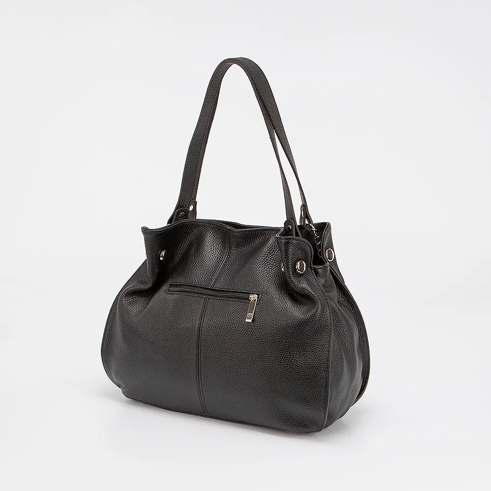 Сумка от торговой марки Francesco Molinary выполнена из натуральной кожи черного цвета. Модель с двумя ручками. Отделение на молнии. Внутри: фирменная текстильная подкладка, карман и средник на молнии, накладной карман. На задней стороне - карман на молнии.