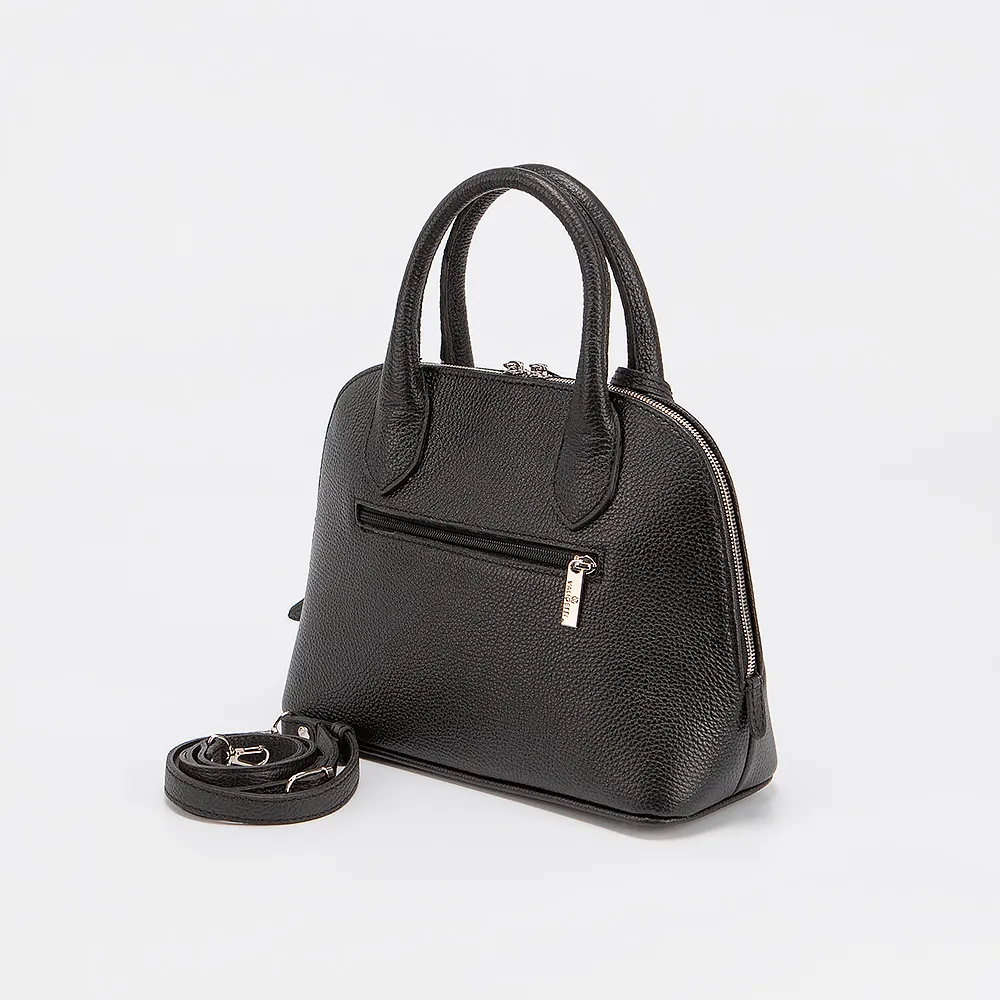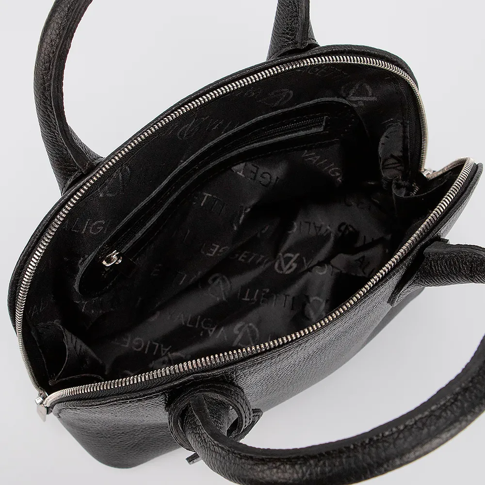 Сумка от торговой марки Valigetti выполнена из натуральной кожи черного цвета. Модель с двумя ручками. Отделение на молнии. Внутри: фирменная текстильная подкладка, карман на молнии, накладной карман. На задней стороне - карман на молнии.