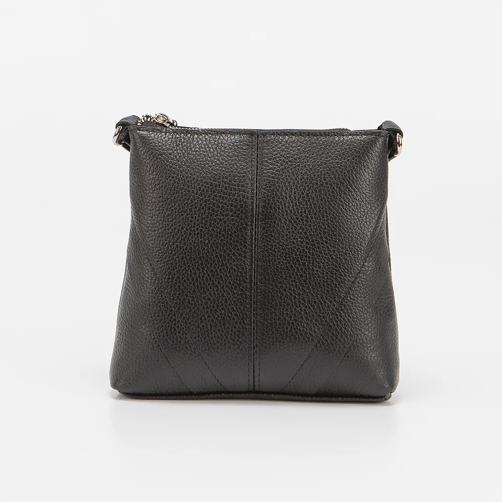 Сумка от торговой марки Francesco Molinary из натуральной кожи черного цвета. Плоская компактная модель с несъемным узким регулируемым плечевым ремнем. Отделение на молнии. Внутри: фирменная подкладка, карман на молнии, накладной карман. На задней стороне - карман на молнии.