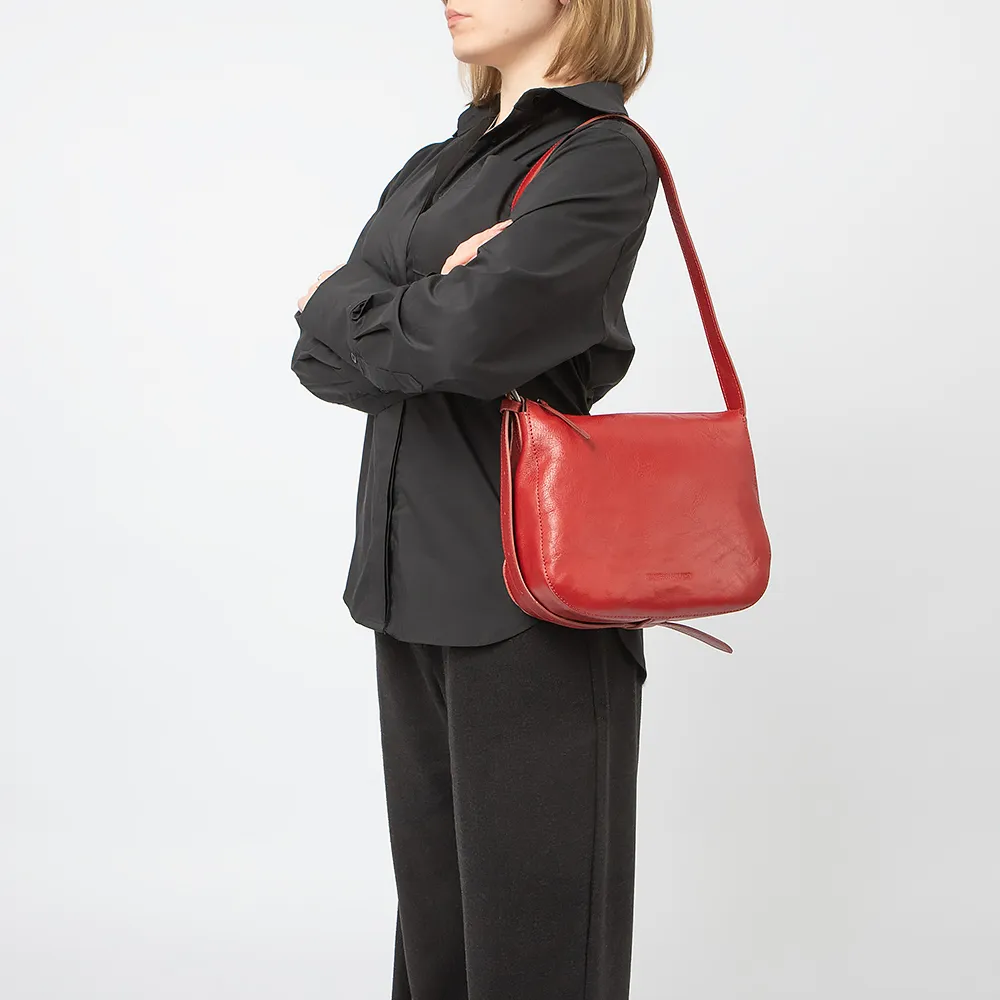 Сумка от торговой марки Francesco Molinary выполнена из натуральной кожи красного цвета. Модель с несъемным регулируемым плечевым ремнем. Отделение на молнии. Внутри: текстильная подкладка, карман и средник на молнии, накладной карман.