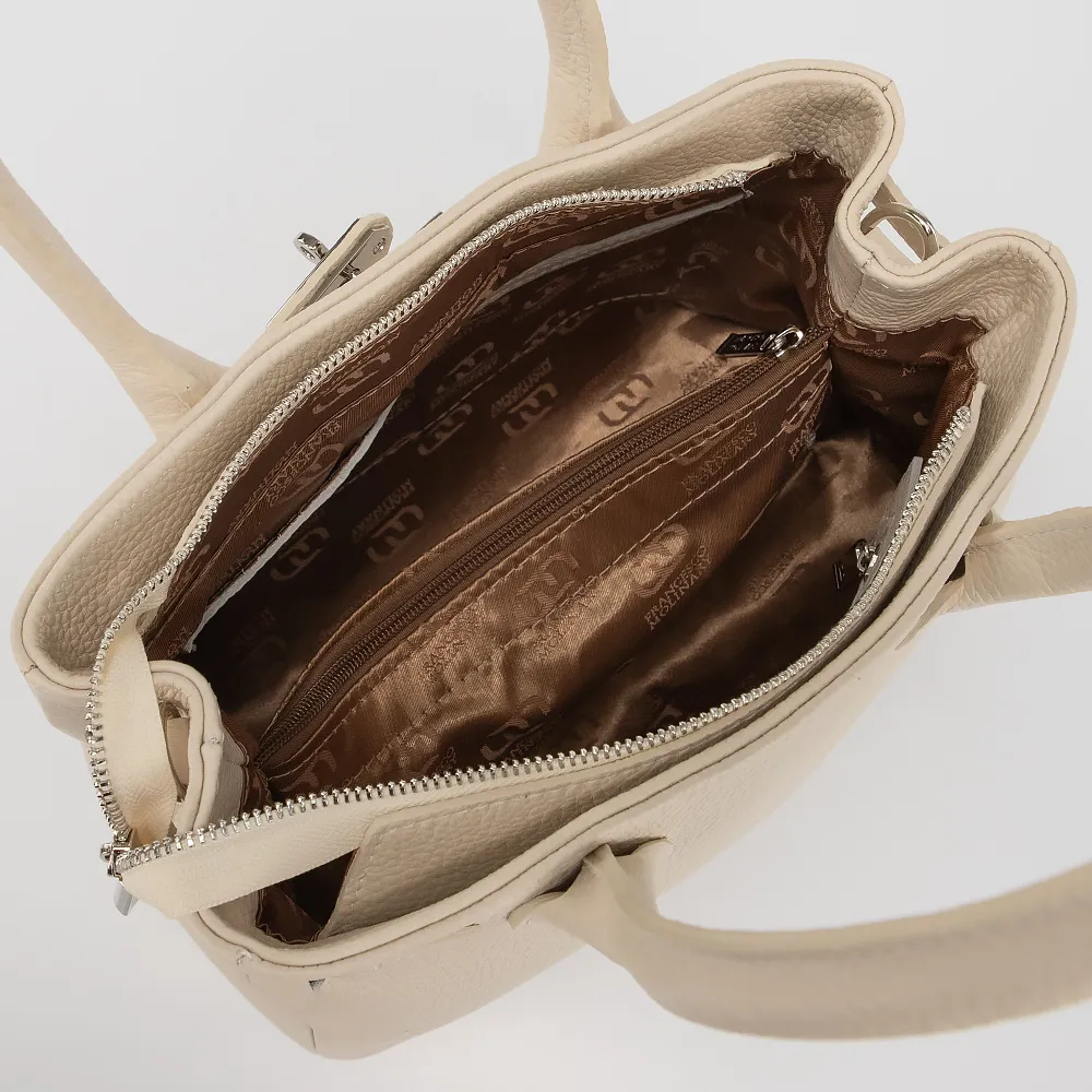 Сумка от торговой марки Francesco Molinary из натуральной кожи бежевого цвета. Модель с двумя ручками и съемным регулируемым плечевым ремнем. Декорирована ремешком на поворотном замке. Отделение на молнии. Внутри: фирменная подкладка, карман и средник на молнии, накладной карман. Дно оснащено металлическими ножками для защиты от износа.