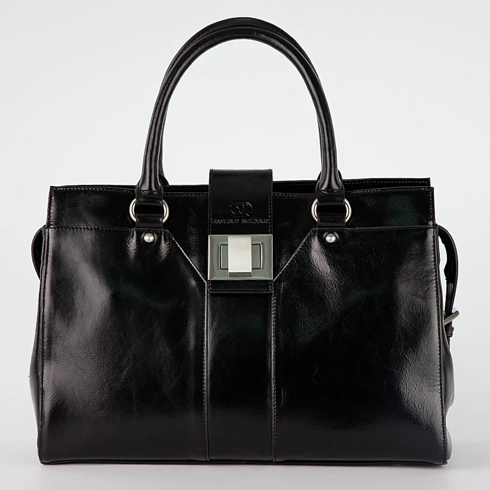 Классическая женская сумка Francesco Molinary формата А4 с декоративным хлястиком с тиснением Francesco Molinary, закрывающийся на замок. Модель с одним текстильным отделением на молнии, выполнена из натуральной мягкой кожи. Внутри средник на молнии, кармашки для телефона и мелочей, удобное отделение на молнии для документов. Снаружи, на задней стенке, карман на молнии. Металлическая фурнитура и ножки на дне серебристого цвета. В комплекте съемный регулируемый плечевой ремень из натуральной кожи.
