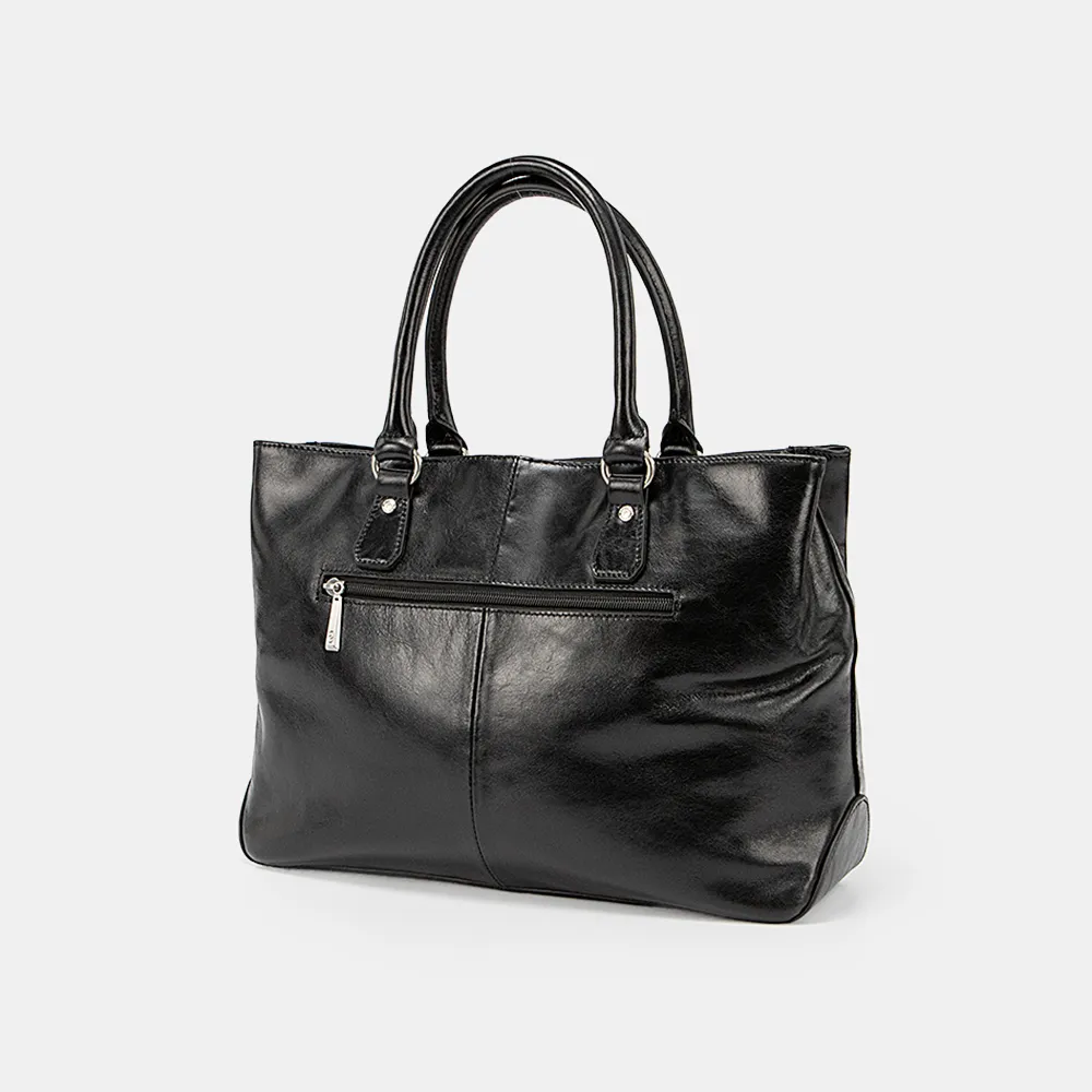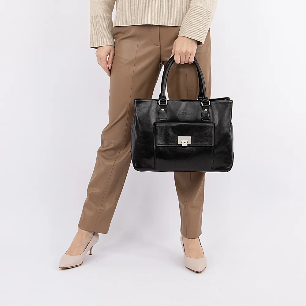 Сумка от торговой марки Francesco Molinary выполнена из натуральной кожи черного цвета. Модель с двумя удлиненными ручками на кольцах-держателях. Отделение на молнии. Внутри: фирменная подкладка, средник и карман на молнии, два накладных кармана. На лицевой стороне – накладной карман с клапаном на цупферном замке, на задней – карман на молнии. Дно оснащено кожаными накладками для защиты от износа. Размер подходит для документов формата А4.