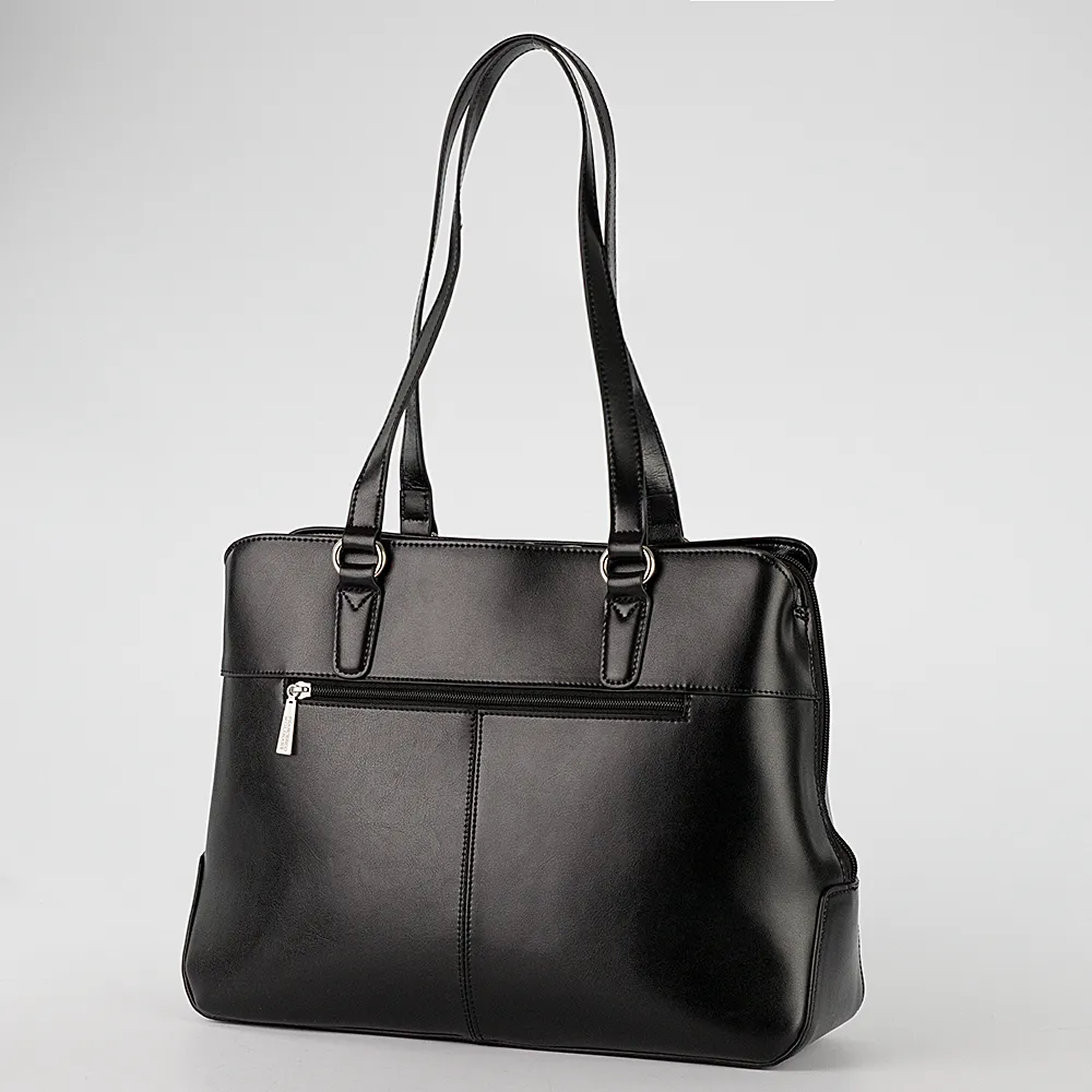 Сумка в деловом стиле от торговой марки Francesco Molinary выполнена из натуральной кожи черного цвета. Модель с двумя удлиненными ручками. Три отделения с фирменной подкладкой. Два отделения по краям – на магнитной кнопке. Основное отделение на молнии по трем сторонам, внутри: карман на молнии. На задней стороне – карман на молнии.