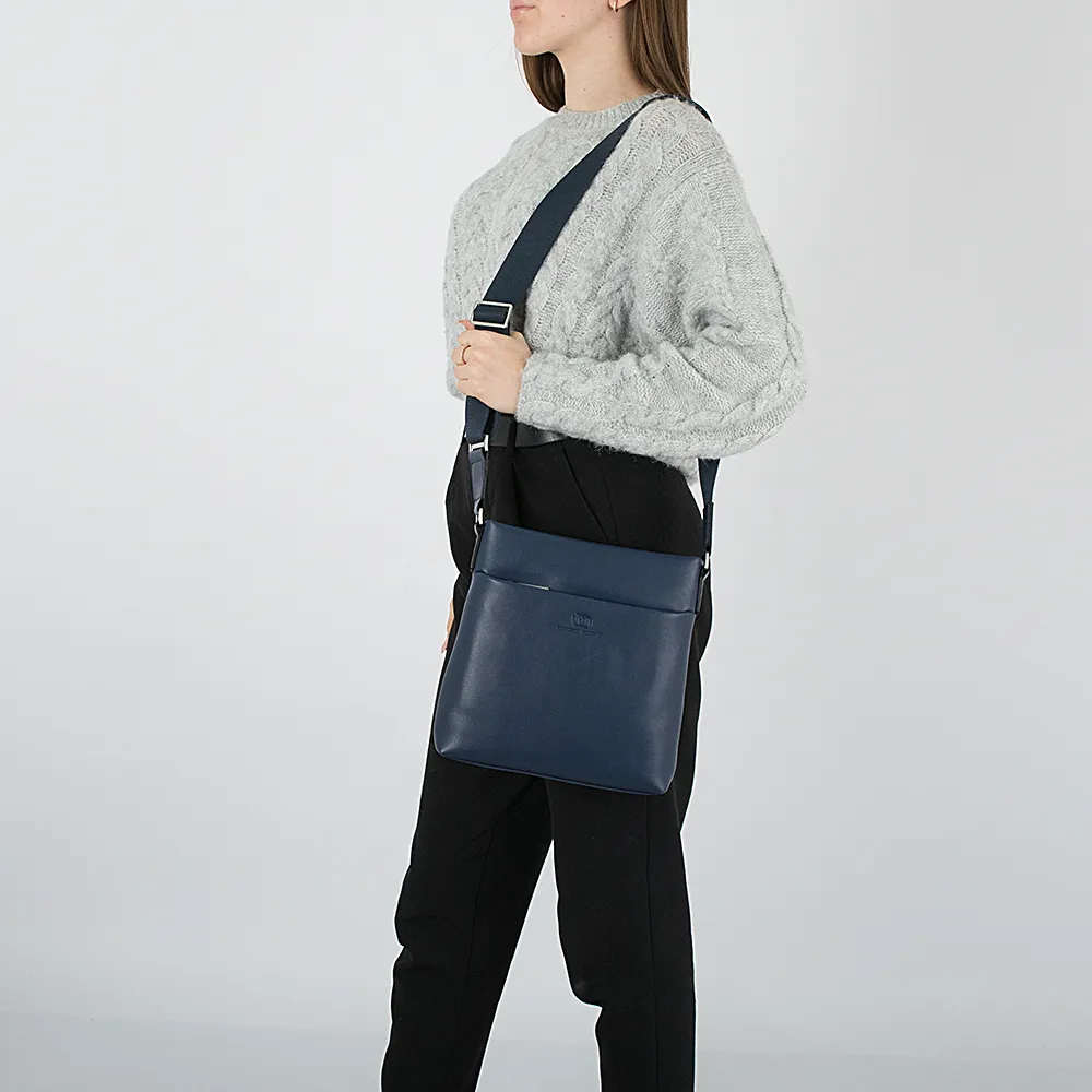 Сумка-планшет от торговой марки Francesco Molinary из натуральной кожи синего цвета. Модель вертикальной ориентации с несъемным регу лируемым плечевым ремнем из текстильного материала. Отделение на молнии. Внутри: фирменная подкладка, карман на молнии два накладных кармана. На лицевой и задней сторонах – карман на молнии.