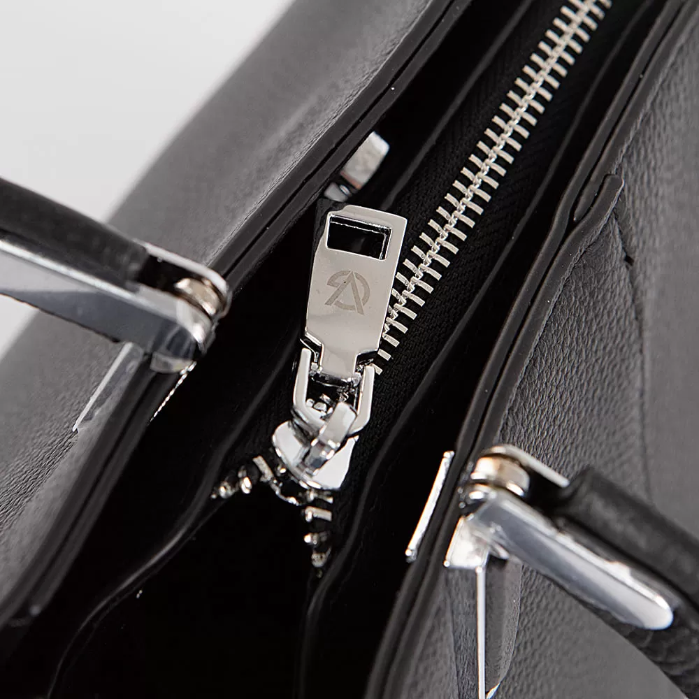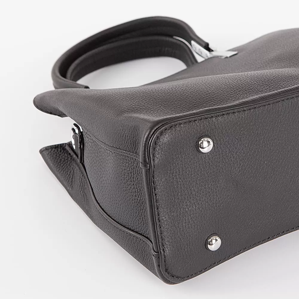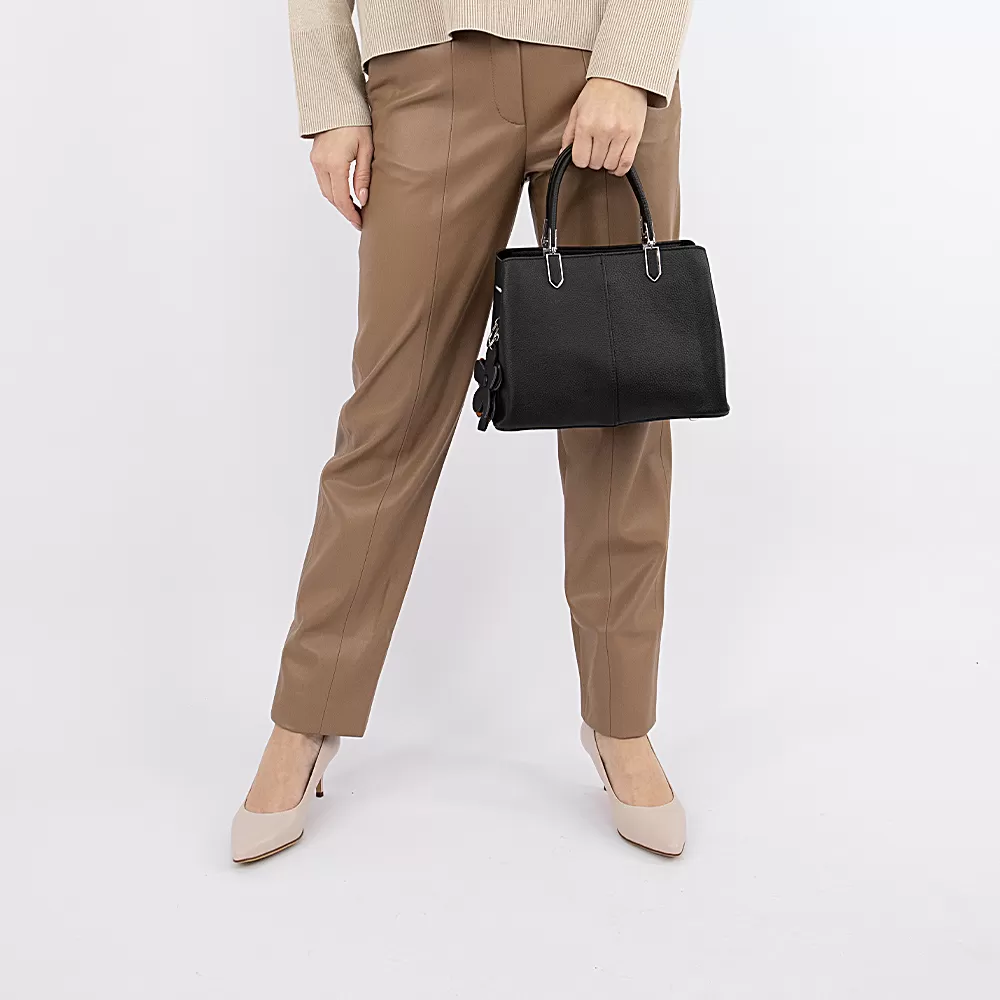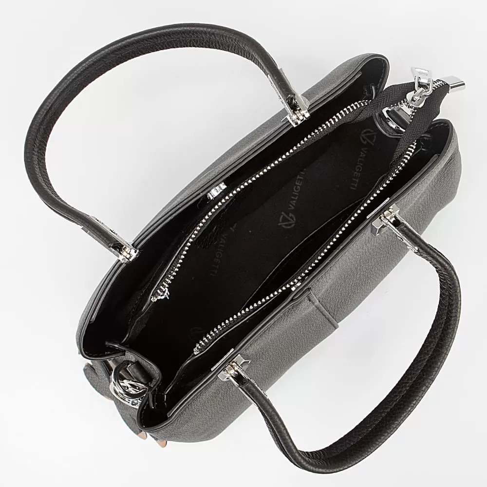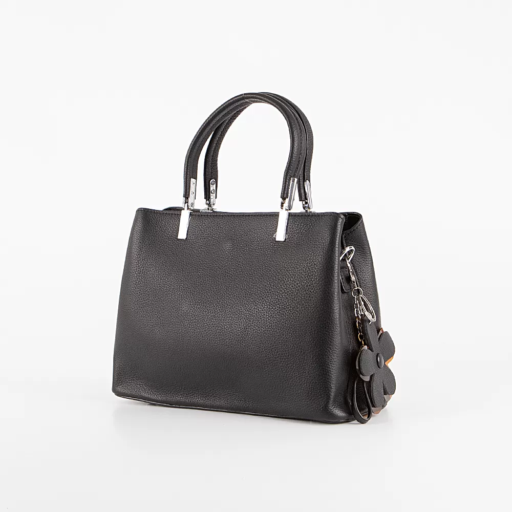 Сумка бренда Valigetti из натуральной кожи черного цвета - это компактная модель с двумя ручками и съемным регулируемым плечевым ремнем. Три отделения, два из которых по бокам, фиксируются магнитной кнопкой. Среднее отделение на молнии, внутри карман на молнии и один накладной карман. Дно сумочки оснащено ножками для защиты от износа. В комплекте имеется оригинальный съемный брелок с цветком на цепочке.