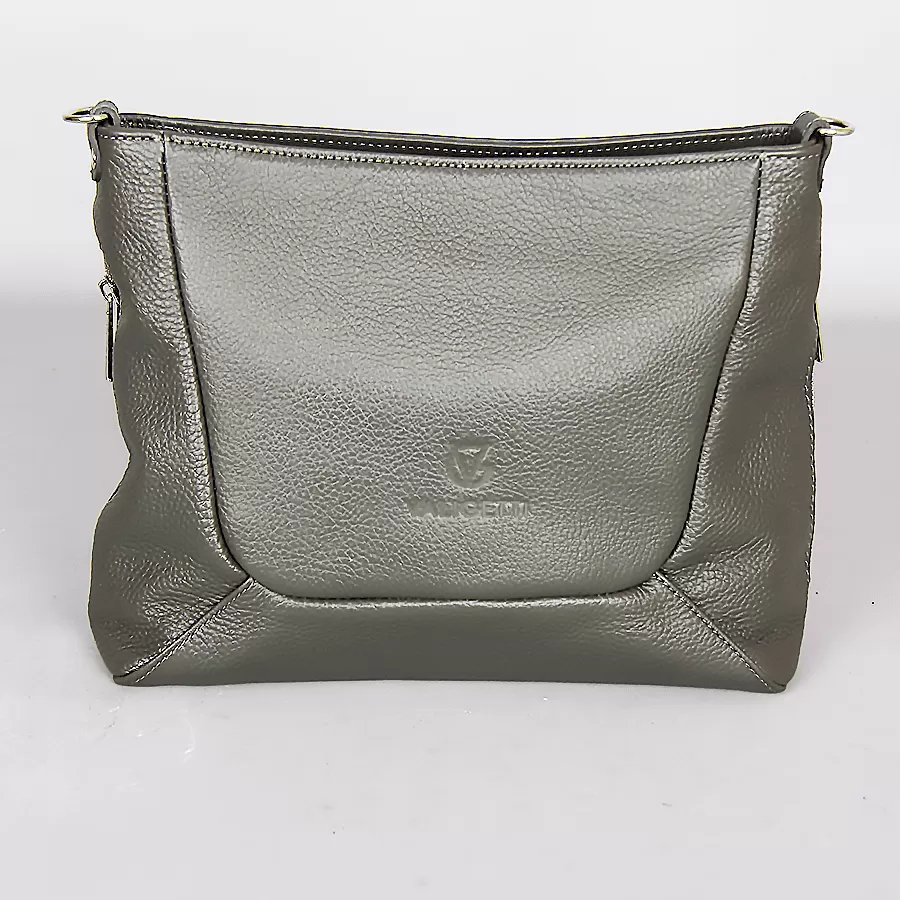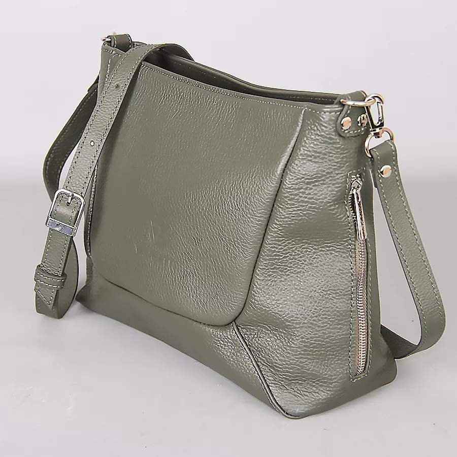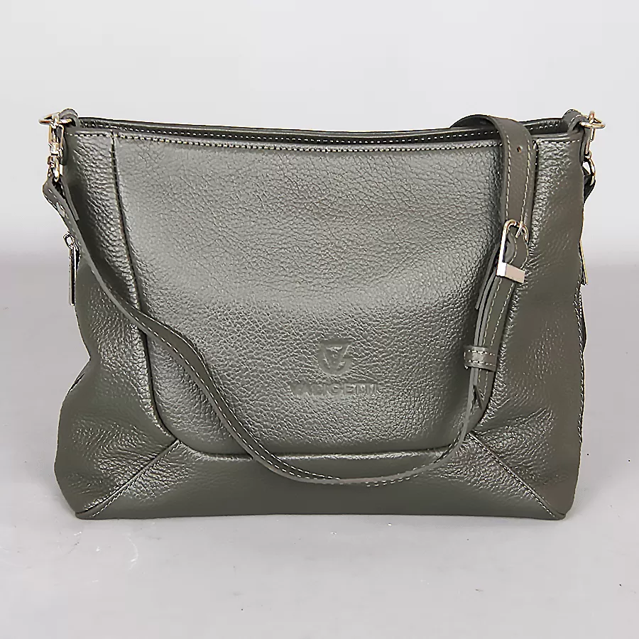 Сумка из натуральной кожи бренда Valigetti выполнена в зеленом цвете, имеет два боковых крмана быстрого доступа на молнии, сзади так же имеется карман на молнии, В компелекте два ремня один нерегулируемый для носки как в руках так и на плече, второй длинный регулируемый плечевой ремень. У сумочки одно освновное отделение с фирменной подкладкой в котором расположено два накладных кармана и один карман на молнии.