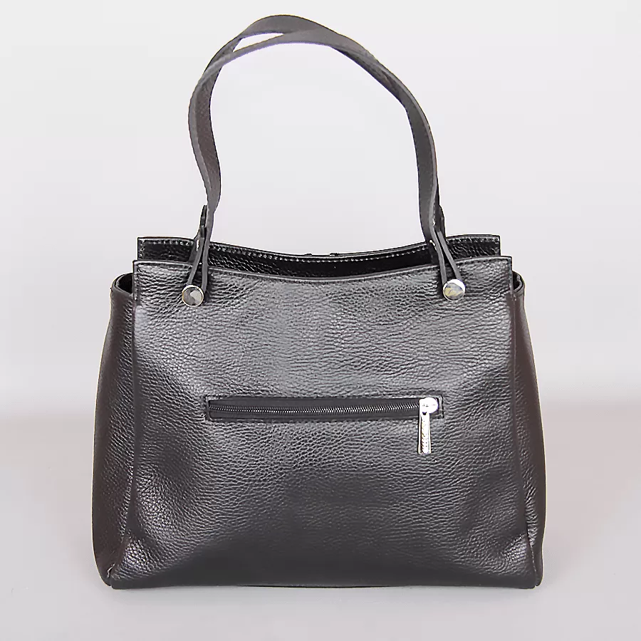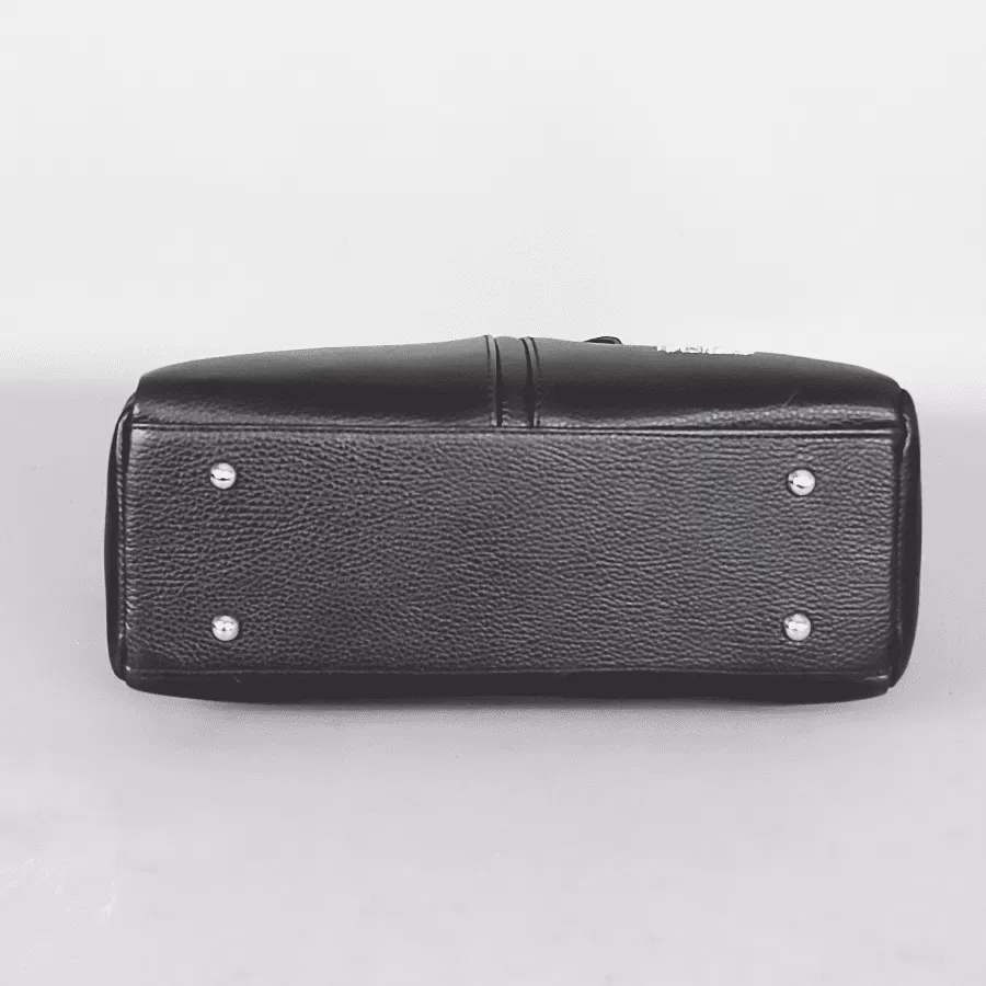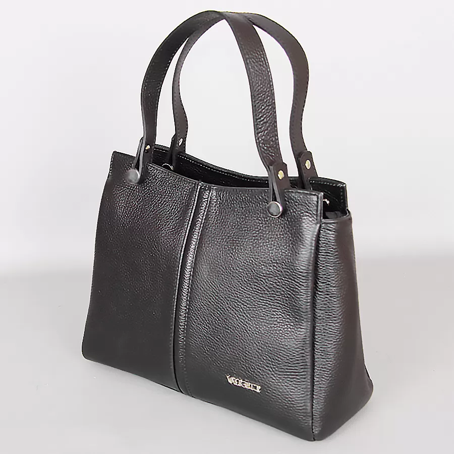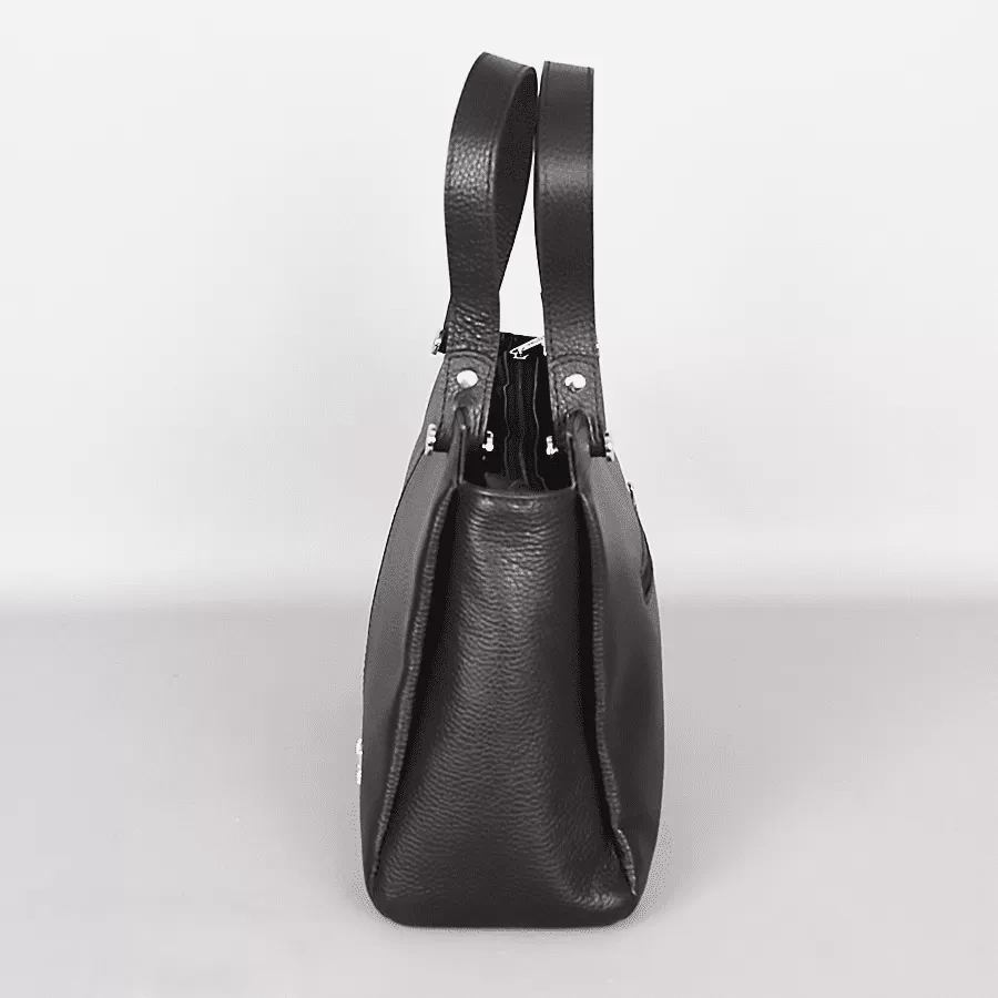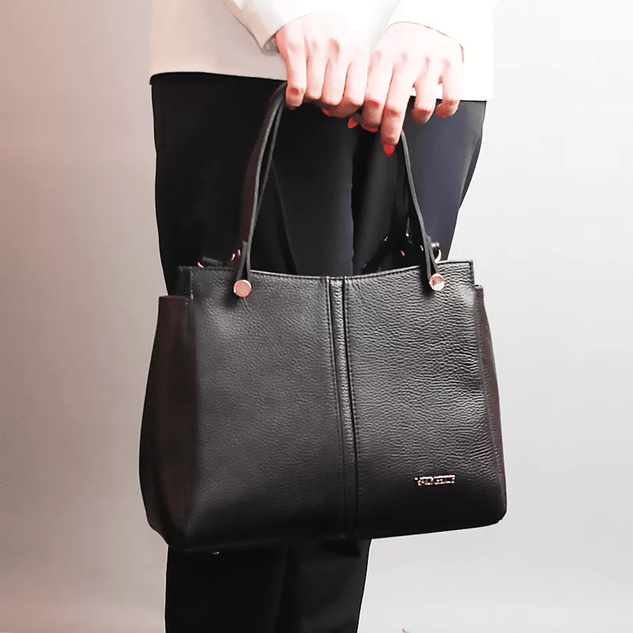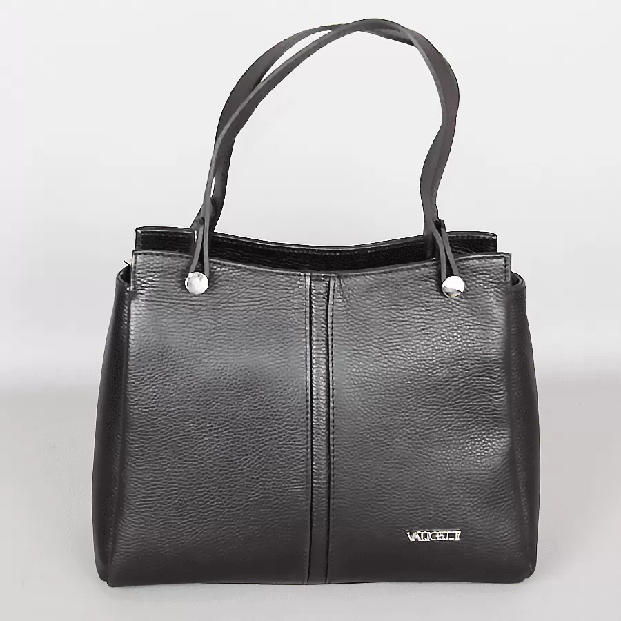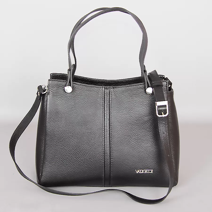 Сумка из натуральной кожи бренда Valigetti выполнена в черном цвете. Модель с длинными ручками и съемным регулируемым плечевым ремнем. На задней стороне сумки расположен карман быстрого доступа для мелочей. Одно основное отделение с фирменной подкладкой имеет боковой карман на молнии, средний карман на молнии и два боковых накладных кармана. У сумочки есть металлические ножки для избежания загрязнений и износа.