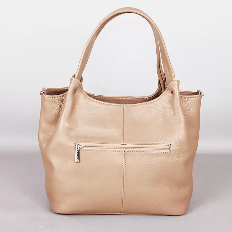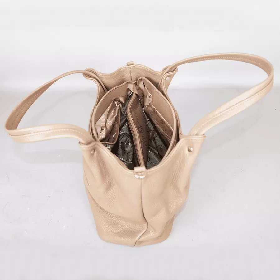 Сумка имеет одно большое отделение, которое закрывается на молнию. Внутри сумки есть карман на молнии и открытый кармашек для мелочей. Сзади расположен карман на молнии для более быстрого доступа к нужным вещам.