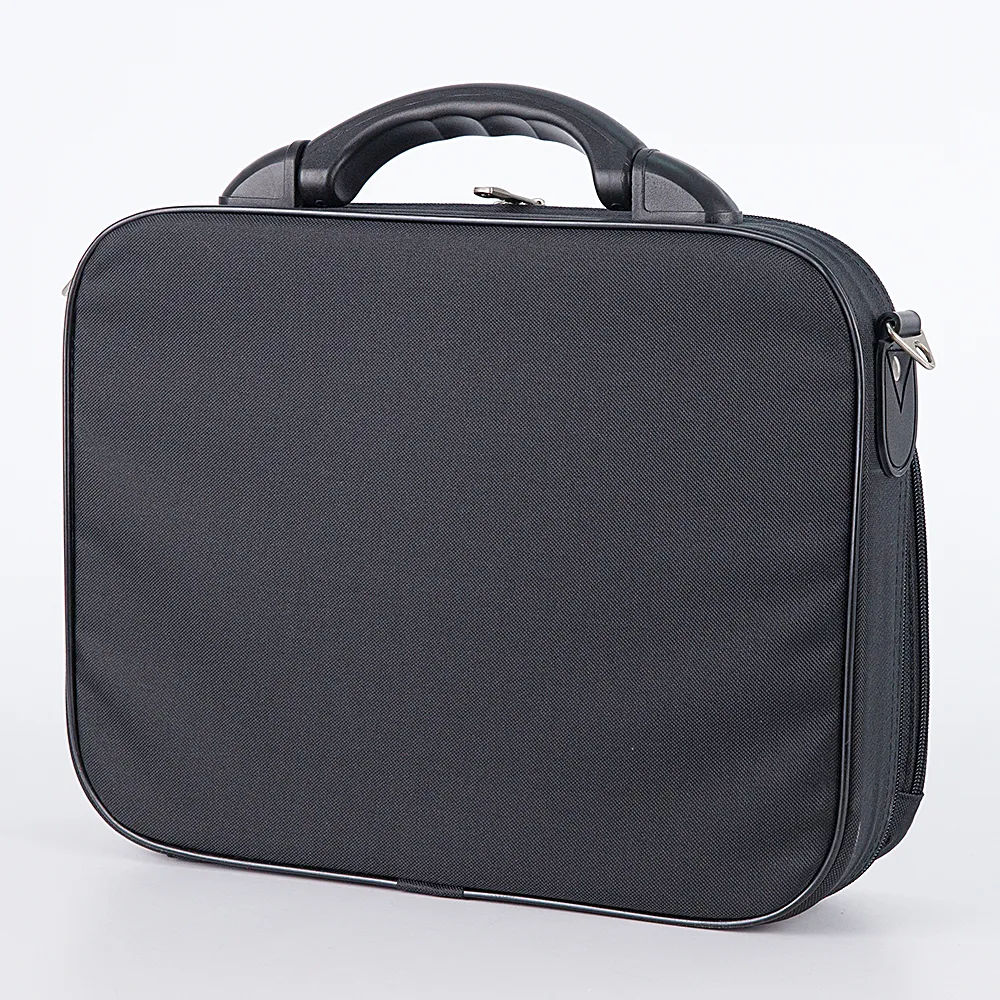 Кейс от торговой марки Mr.Bag выполнен из плотного текстильного материала черного цвета. Модель с плотной пластиковой ручкой и съемным регулируемым плечевым ремнем. Отделение на молнии по трем сторонам, что обеспечивает широкое раскрытие. Внутри: текстильная подкладка. На лицевой стороне – карман на молнии. Вес – 1,1 кг.