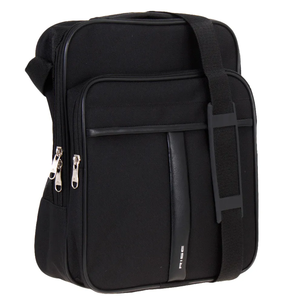 Вместительная сумка от торговой марки Rise из полиэстера черного цвета с декоративной вставкой из искусственной кожи. Модель вертикальной ориентации, с ручкой и несъемным регулируемым плечевым ремнем. Отделение на молнии без подкладки. На лицевой стороне – объемный накладной карман на молнии с частичной подкладкой, карман на скрытой молнии.