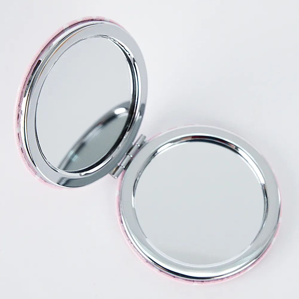 Стильное двойное зеркало выполнено из металла и искусственной кожи розового цвета «в горошек» с изображением помады и надписью «Wake up and make up» (“Проснись и сделай макияж""). Модель круглой формы, раскрывается книжкой.