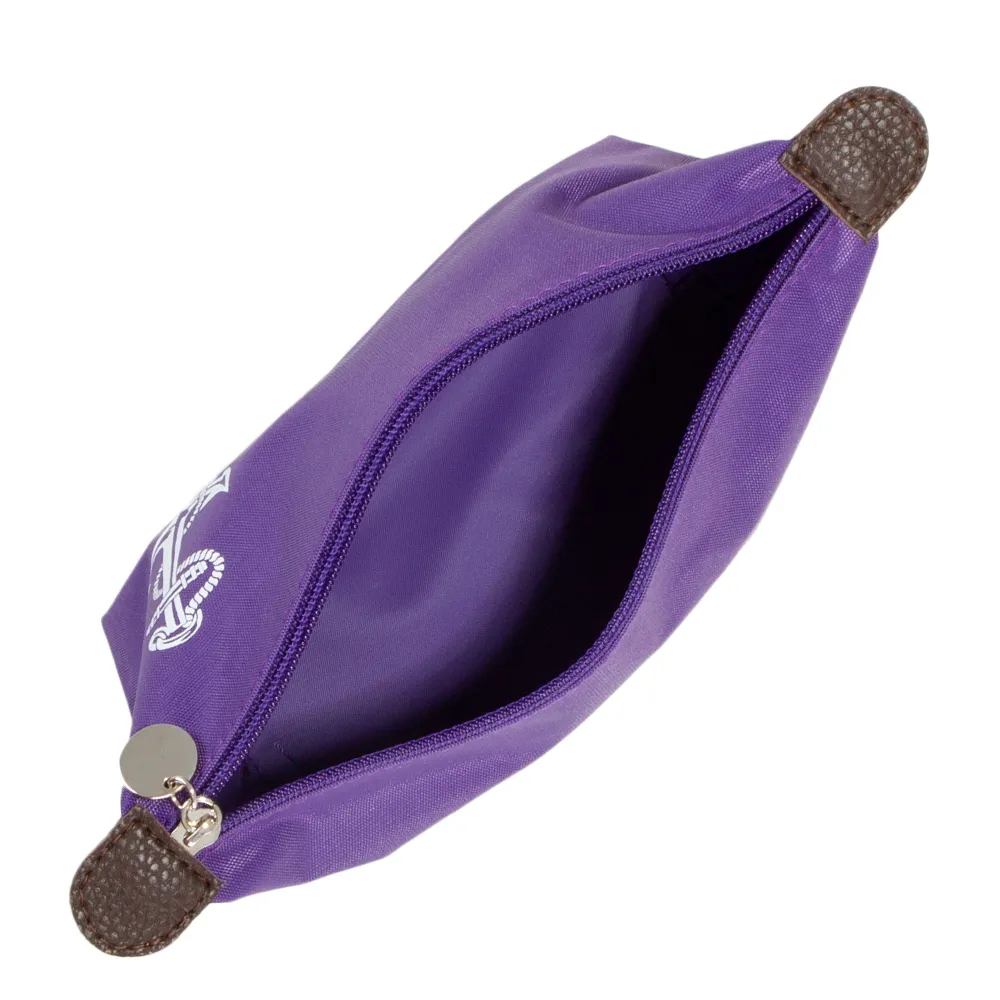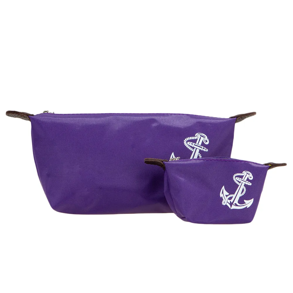 Набор из двух косметичек от торговой марки Antan выполнен из плотного нейлона фиолетового цвета с отделкой из искусственной кожи. На лицевой стороне – принт с якорем. Модель жесткая, устойчивая. Отделение на молнии с оригинальным пуллером-подвеской.
