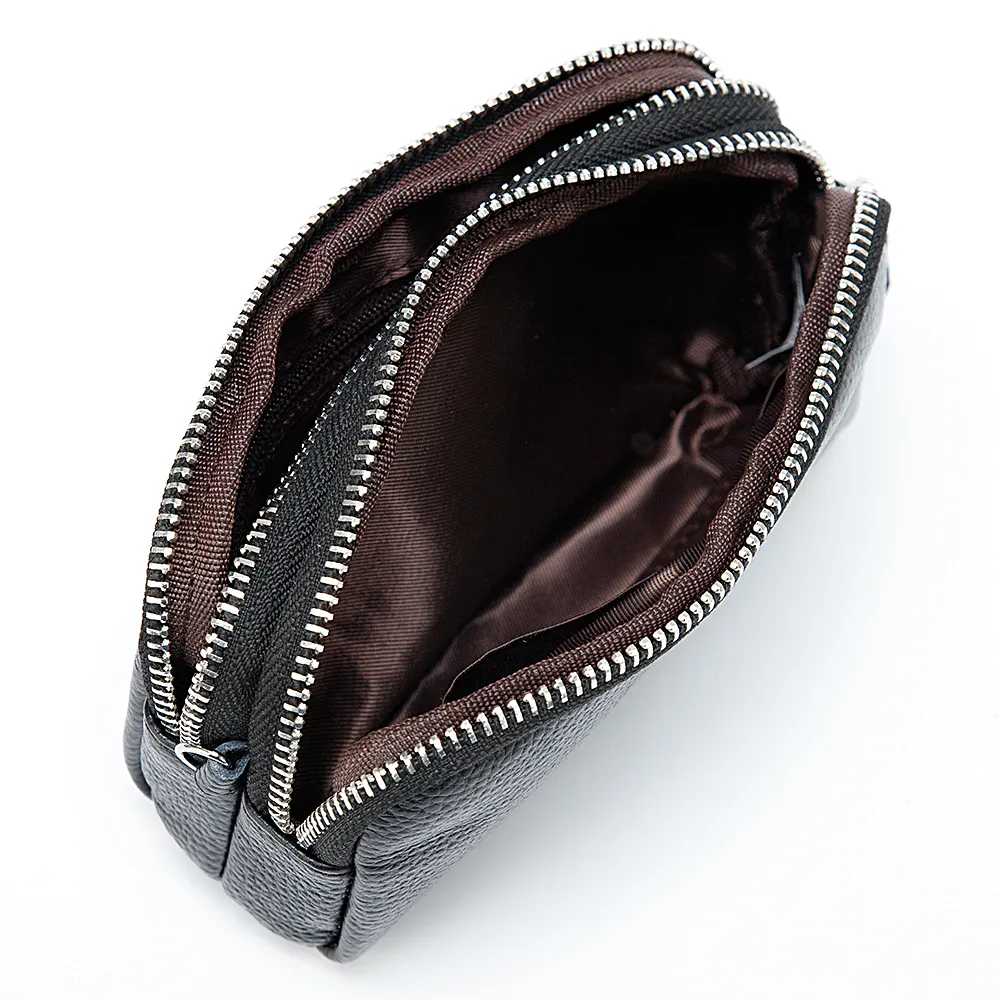 Элегантная женская косметичка Poshete выполнен из фактурной натуральной кожи. Максимально удобна в обращении, оснащена коротким ремешком для запястья. Два независимых отделения на металлических молниях, внутри текстильная подкладка и дополнительные кармашки. Модель чёрного цвета, дополнена металлической золотистой фурнитурой.