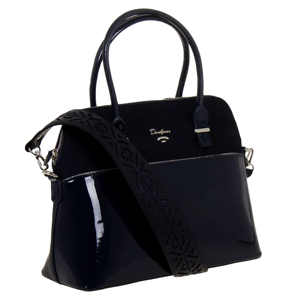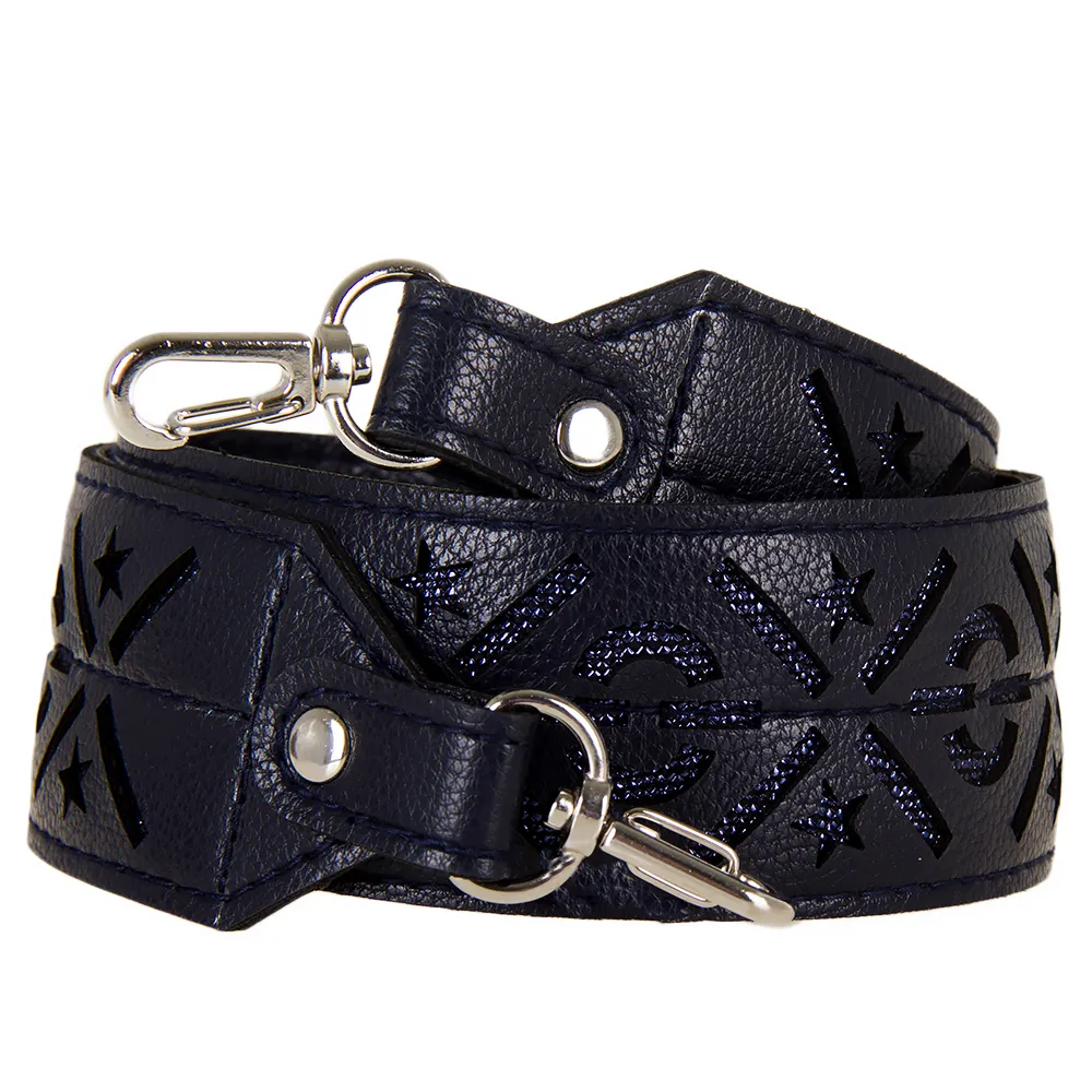 Стильный, женский, сменный ремень для сумки от бренда Shane выполнен из искусственной кожи в тёмно-синем цвете. Украшен перфорацией с подкладкой глянцевого синего цвета. Ширина 5 см. Крепится металлическими карабинами. Длина позволяет носить сумку, с таким ремнем, на плече.