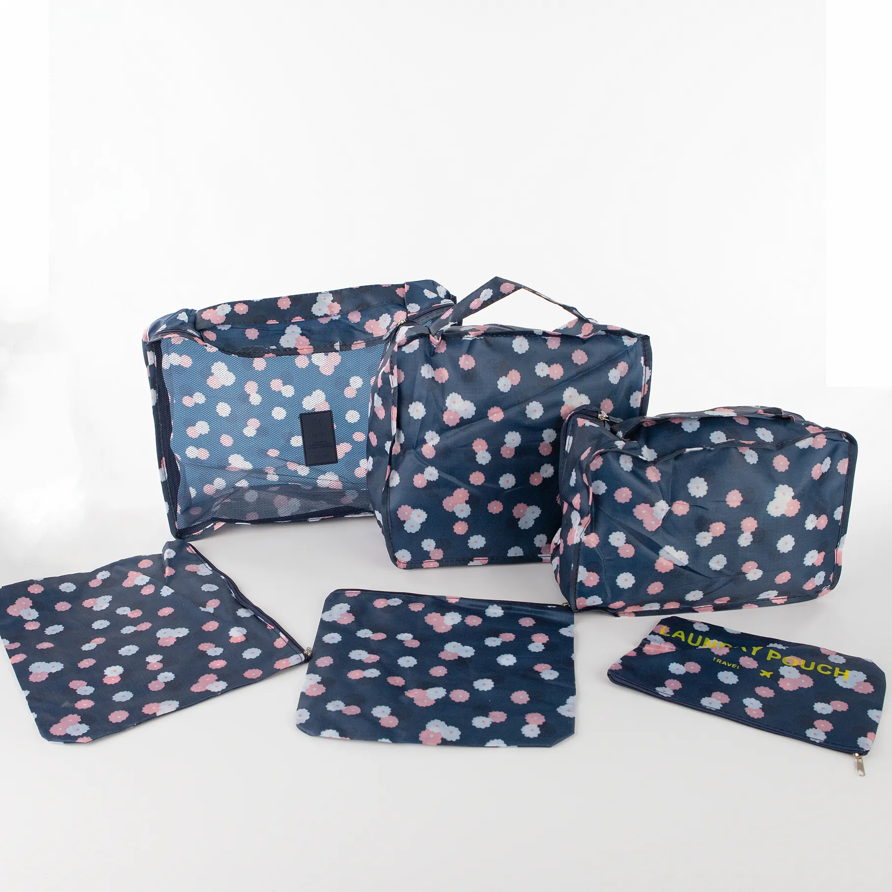 Набор косметичек из текстильного материала для косметических и гигиенических принадлежностей. Набор состоит из 3-х объемных и 3-х плоских косметичек с цветочным принтом. Застегиваются молнией. Отличный набор для повседневного пользования и использования во время поездок и путешествий.