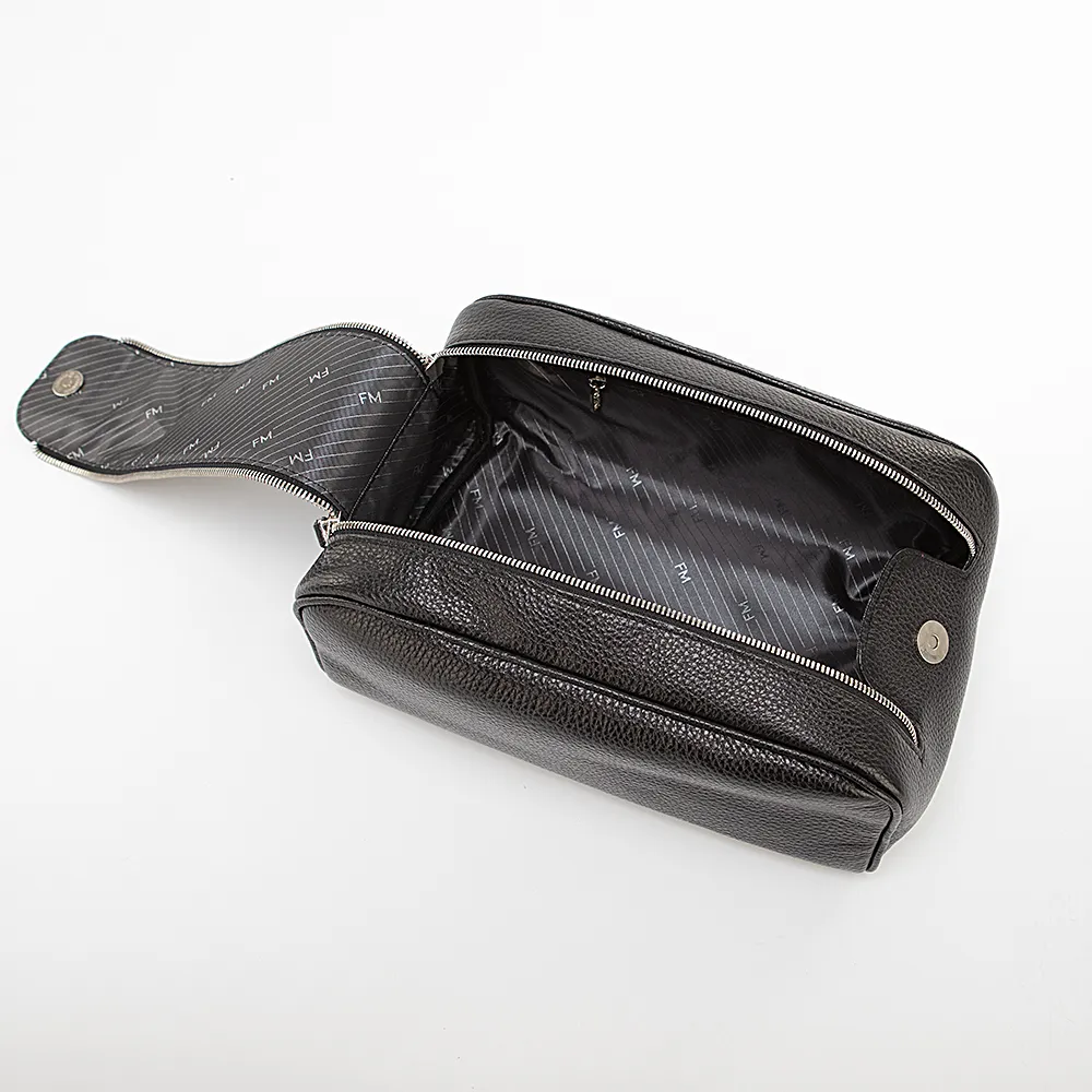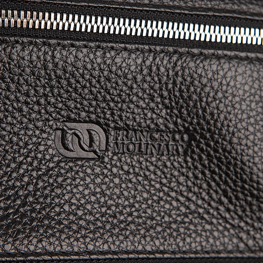 Косметичка от торговой марки Francesco Molinary из натуральной кожи черного цвета. Отделение закрывается двумя молниями с одним пуллером, выполняющим роль лямки-переноски. Внутри: фирменная подкладка, карман на молнии.