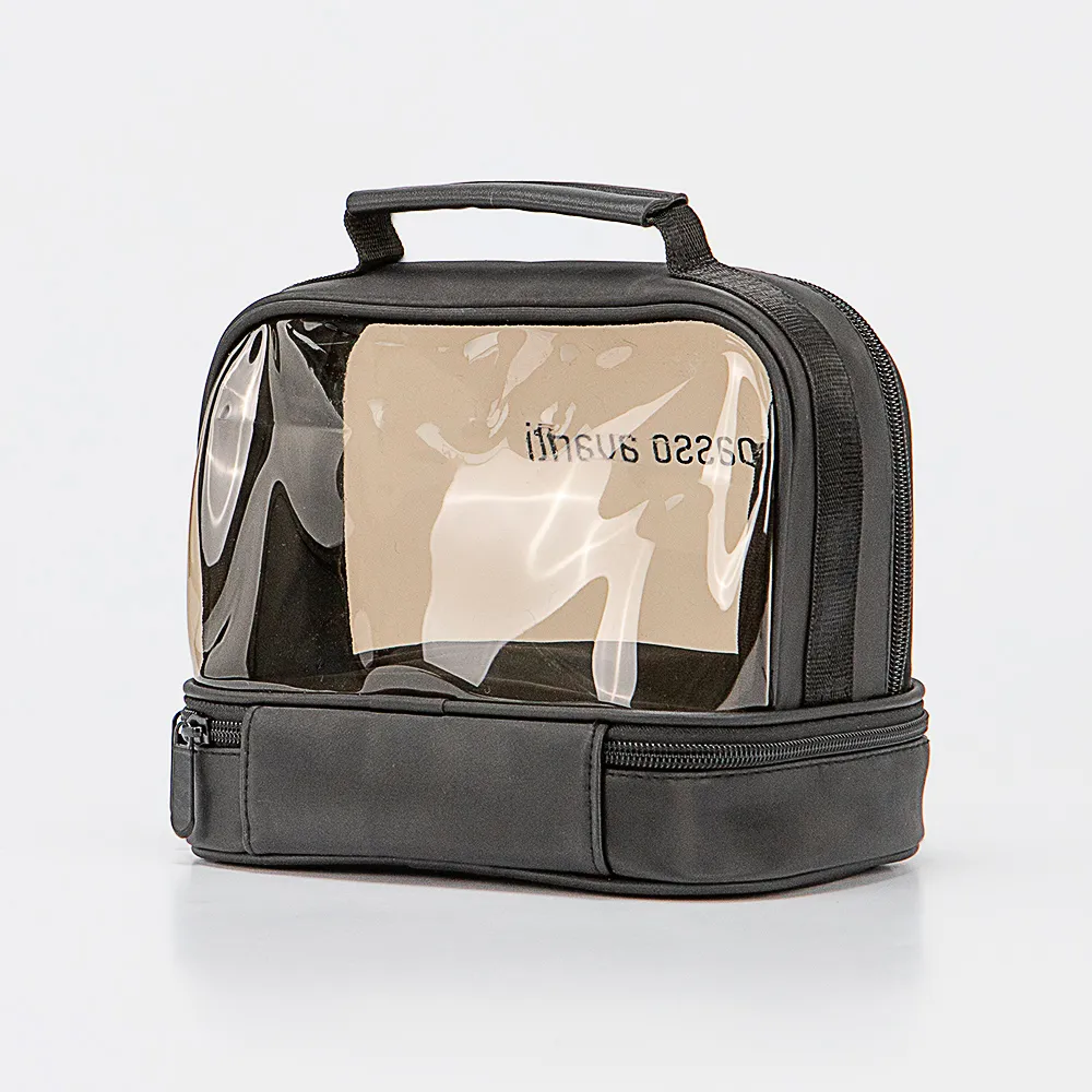 Косметичка от торговой марки Passo Avanti из практичного текстильного материала, искусственной кожи и мягкого прозрачного пластика. Модель с одной ручкой. Два отделения на молнии. В нижнем отделении имеется накладной карман-сетка.