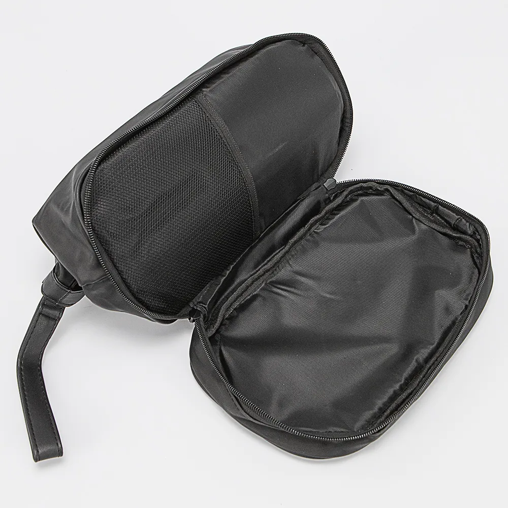 Косметичка от торговой марки Passo Avanti из текстильного материала и искусственной кожи черного цвета. Оригинальная модель с петлей для крепления и ношения на руке. Два отделения, с текстильной подкладкой. Основное отделение имеет рамочный вид открытия на молнии, что обеспечивает удобный доступ. Внутри: карман на молнии, два накладных кармана. Второе отделение расположено в нижней части; внутри: накладной карман-сетка.