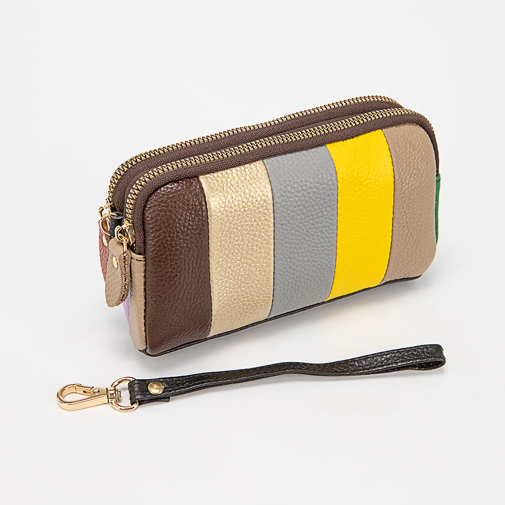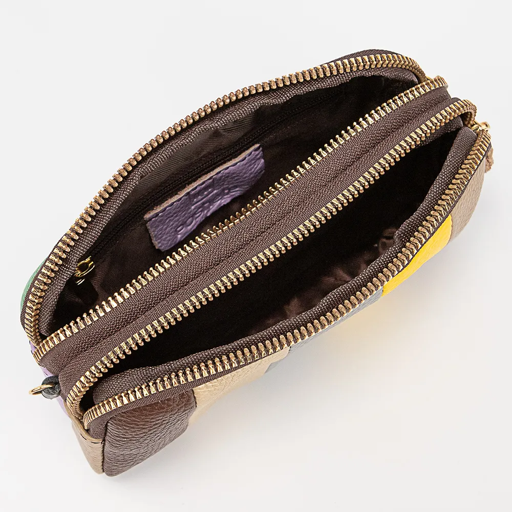 Косметичка от торговой марки Poshete из натуральной кожи с яркими вставками разного цвета. Модель со съемным ремешком для запястья. Два отделения на молнии, с текстильной подкладкой. В одном из них – карман на молнии, в другом – накладной карман.
