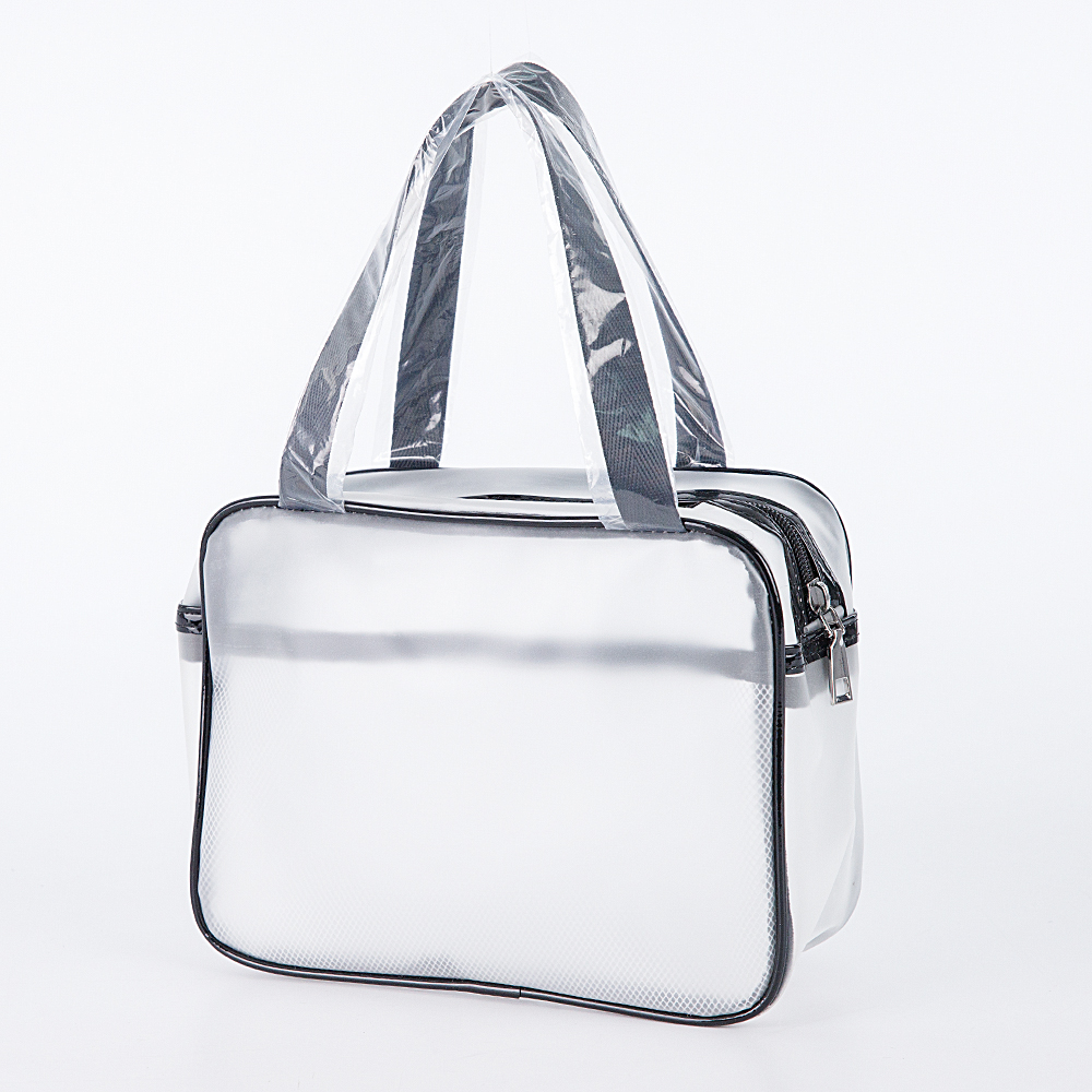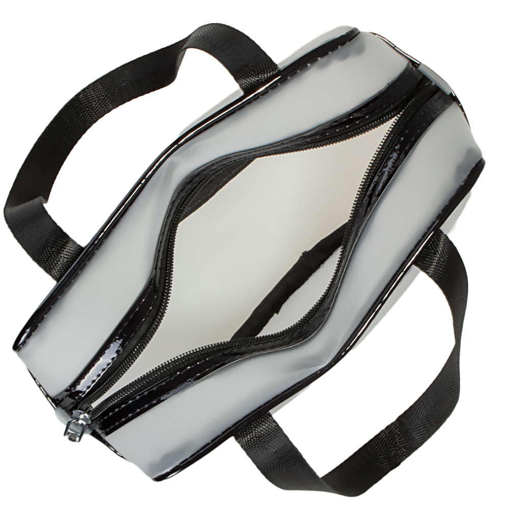 Большая косметичка от бренда Passo Avanti из прозрачного мягкого матового пластика с отделкой из искусственной лакированной кожи черного цвета. Модель закругленной прямоугольной формы, с окантовкой, с двумя удлиненными текстильными ручками. Отделение на молнии, без подкладки.