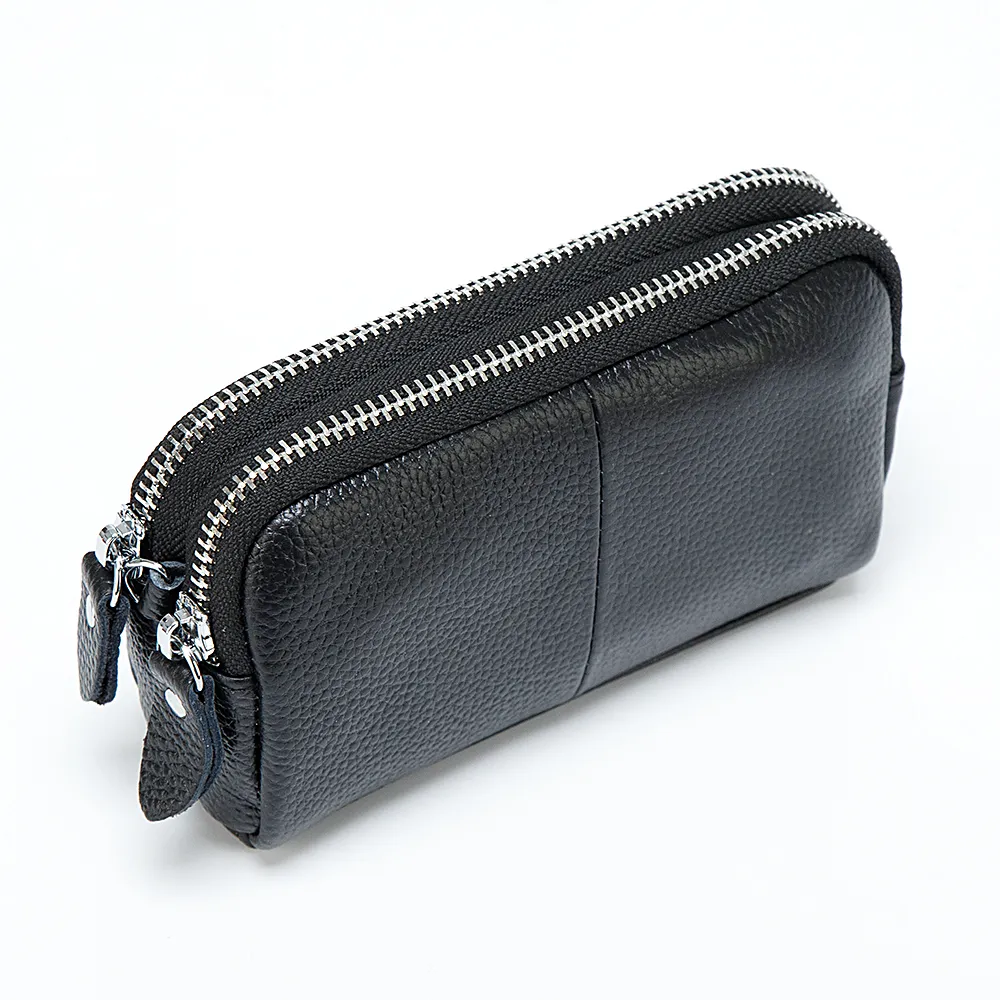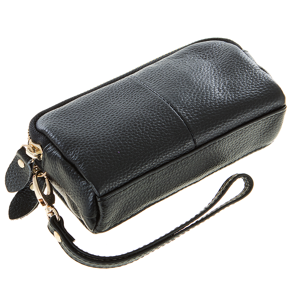 Элегантная женская косметичка Poshete выполнен из фактурной натуральной кожи. Максимально удобна в обращении, оснащена коротким ремешком для запястья. Два независимых отделения на металлических молниях, внутри текстильная подкладка и дополнительные кармашки. Модель чёрного цвета, дополнена металлической золотистой фурнитурой.