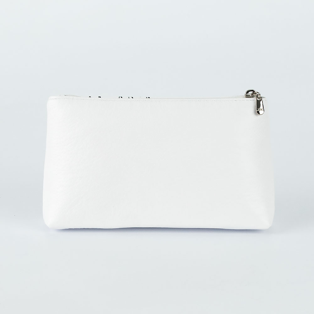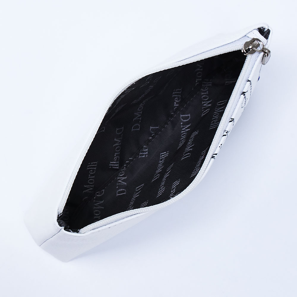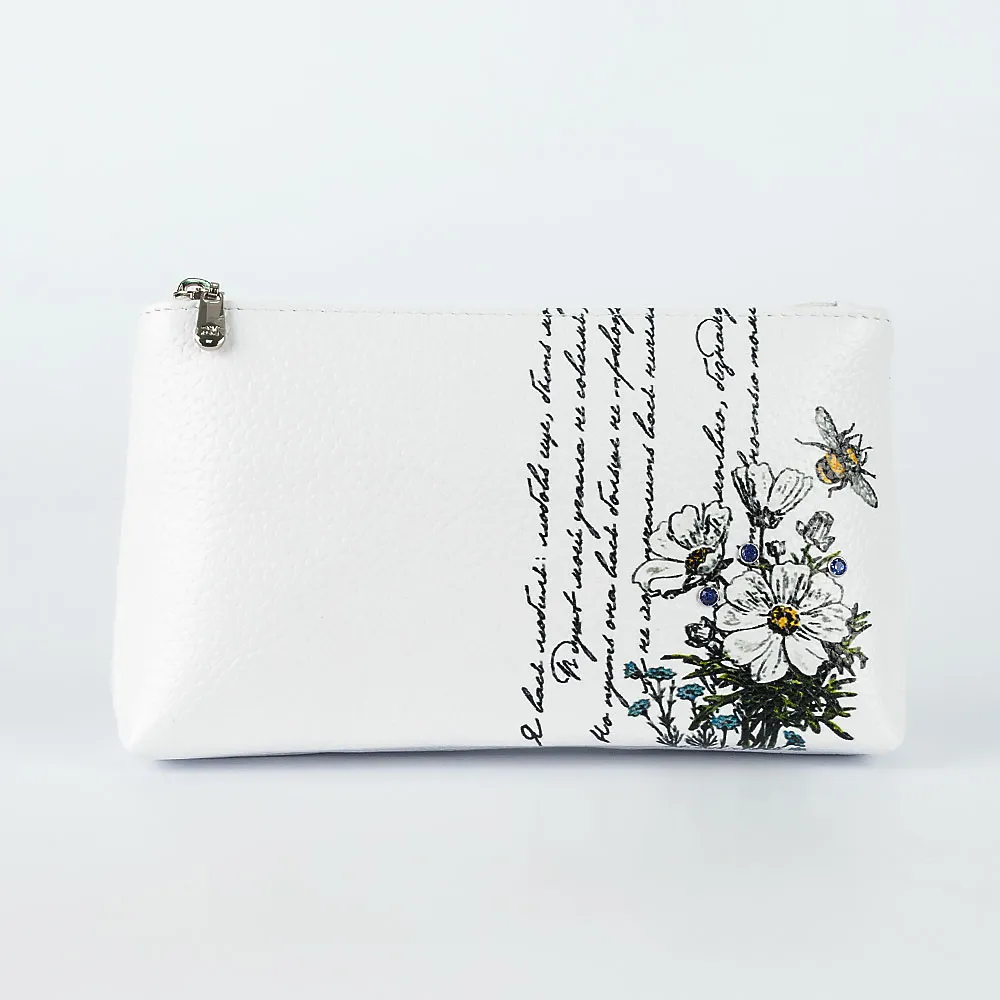 Косметичка от торговой марки Domenico Morelli изготовлена из натуральной кожи белого цвета. Лицевая сторона декорирована оригинальным рисунком с цветами и шмелем, и текстовым принтом со строками из стихотворения А.С.Пушкина «Я вас любил: любовь еще, быть может…». Модель с отделением на молнии. Внутри: фирменная подкладка.