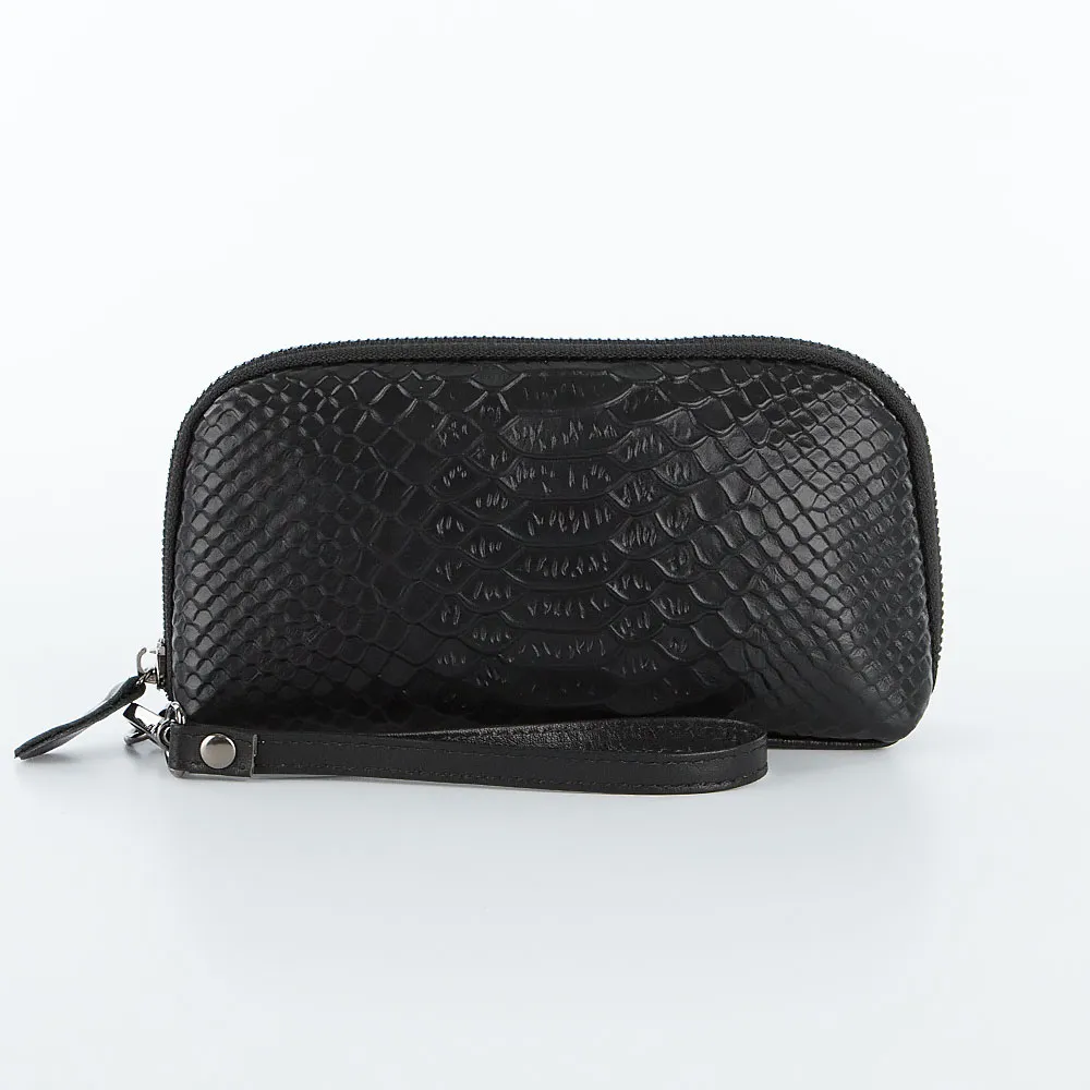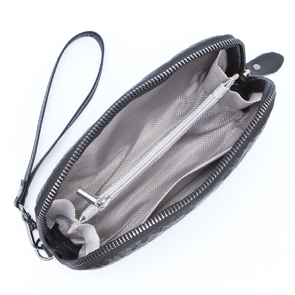 Косметичка от торговой марки Poshete из натуральной кожи черного цвета с тиснением под крокодиловую кожу. Отделение на молнии. Внутри: фирменная подкладка, средник с карманом на молнии и накладной карман. Имеется съемный ремешок для ношения на запястье.