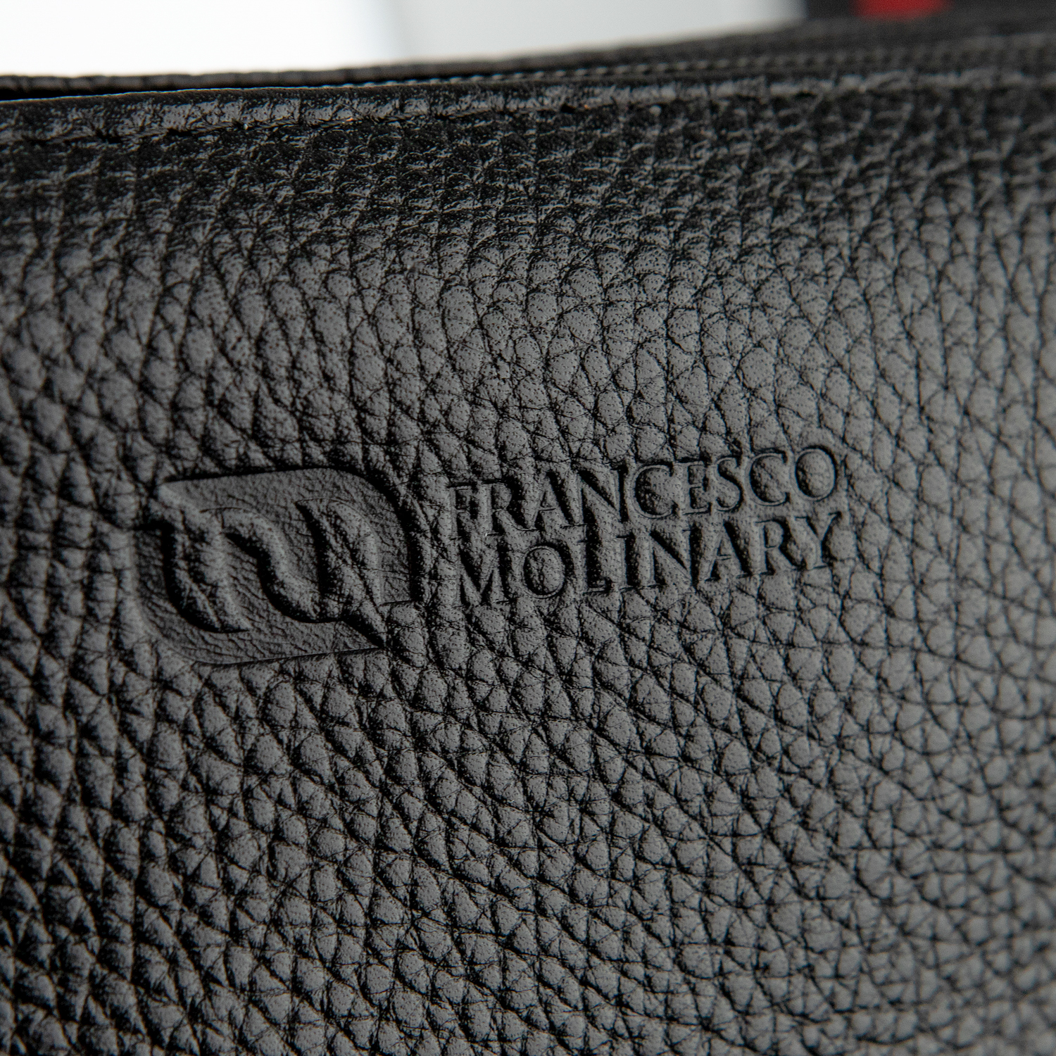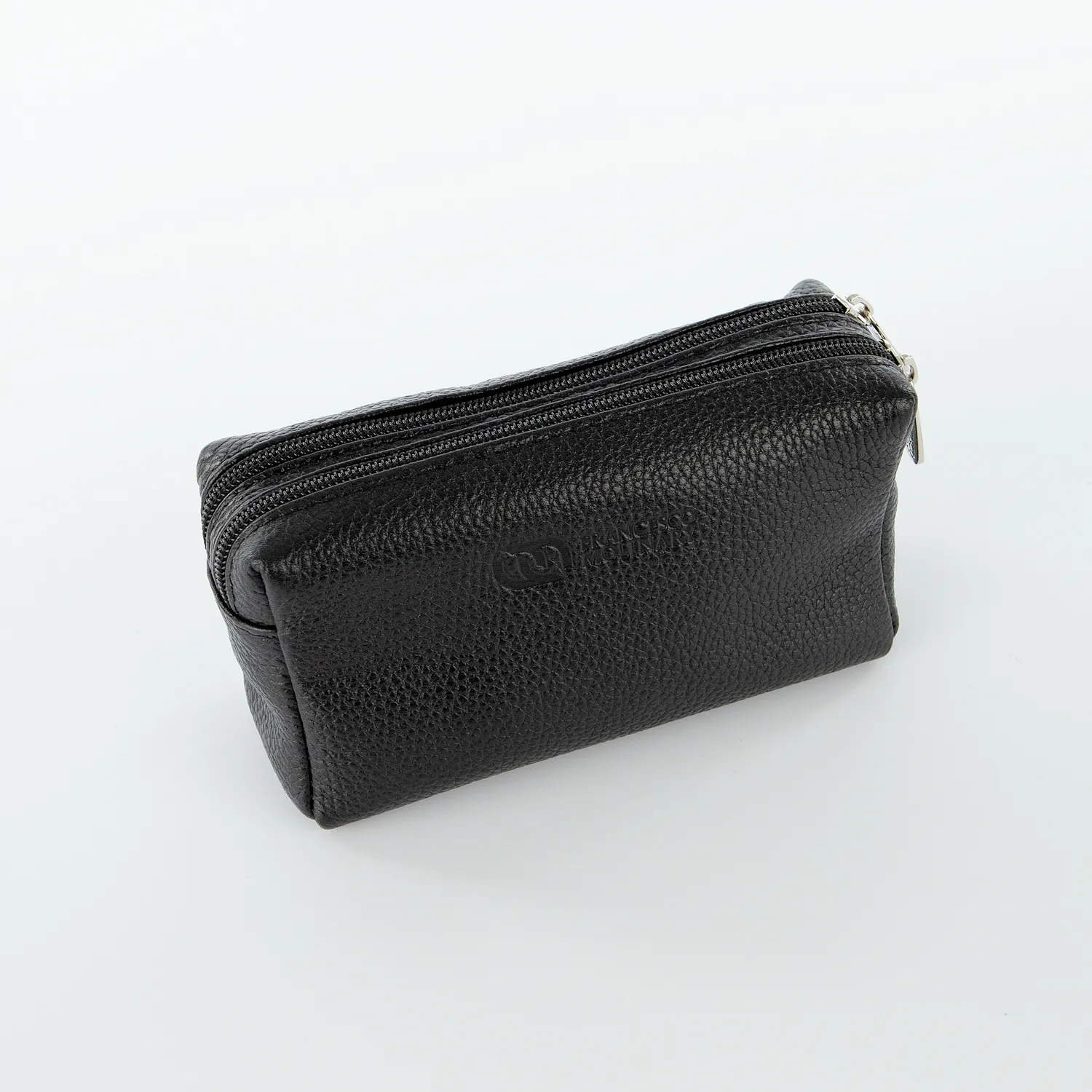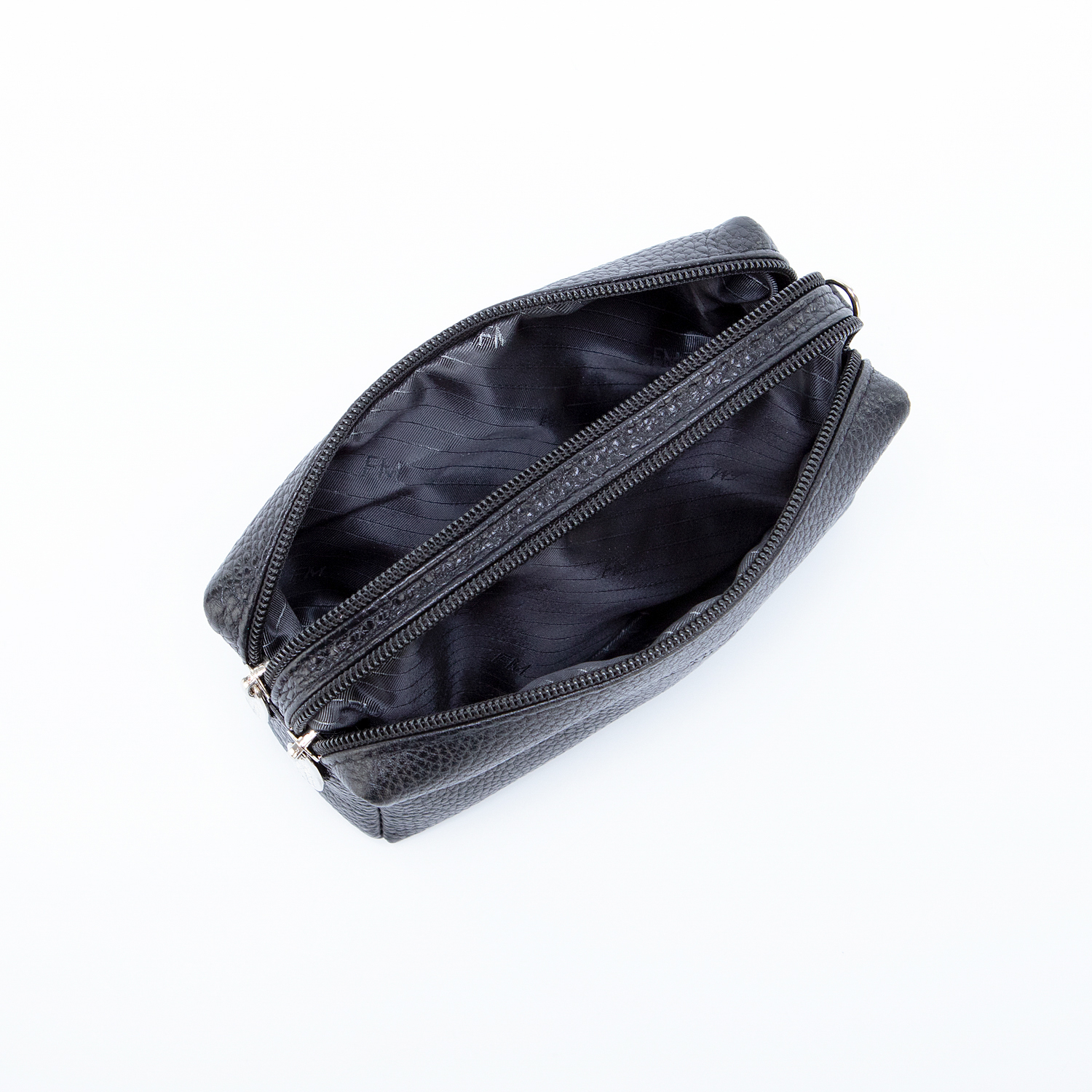Косметичка от торговой марки Francesco Molinary из натуральной кожи черного цвета. Компактная модель со съемным ремешком для ношения на запястье. Два отделения на молнии, с фирменной подкладкой.