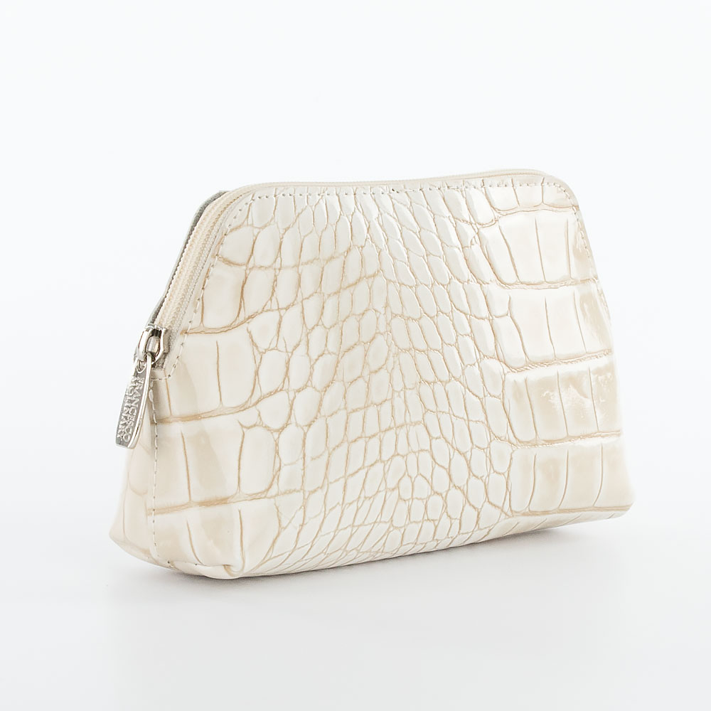 Косметичка от торговой марки Francesco Molinary из натуральной кожи с тиснением под крокодиловую кожу бежевого цвета. Отделение на молнии без подкладки.