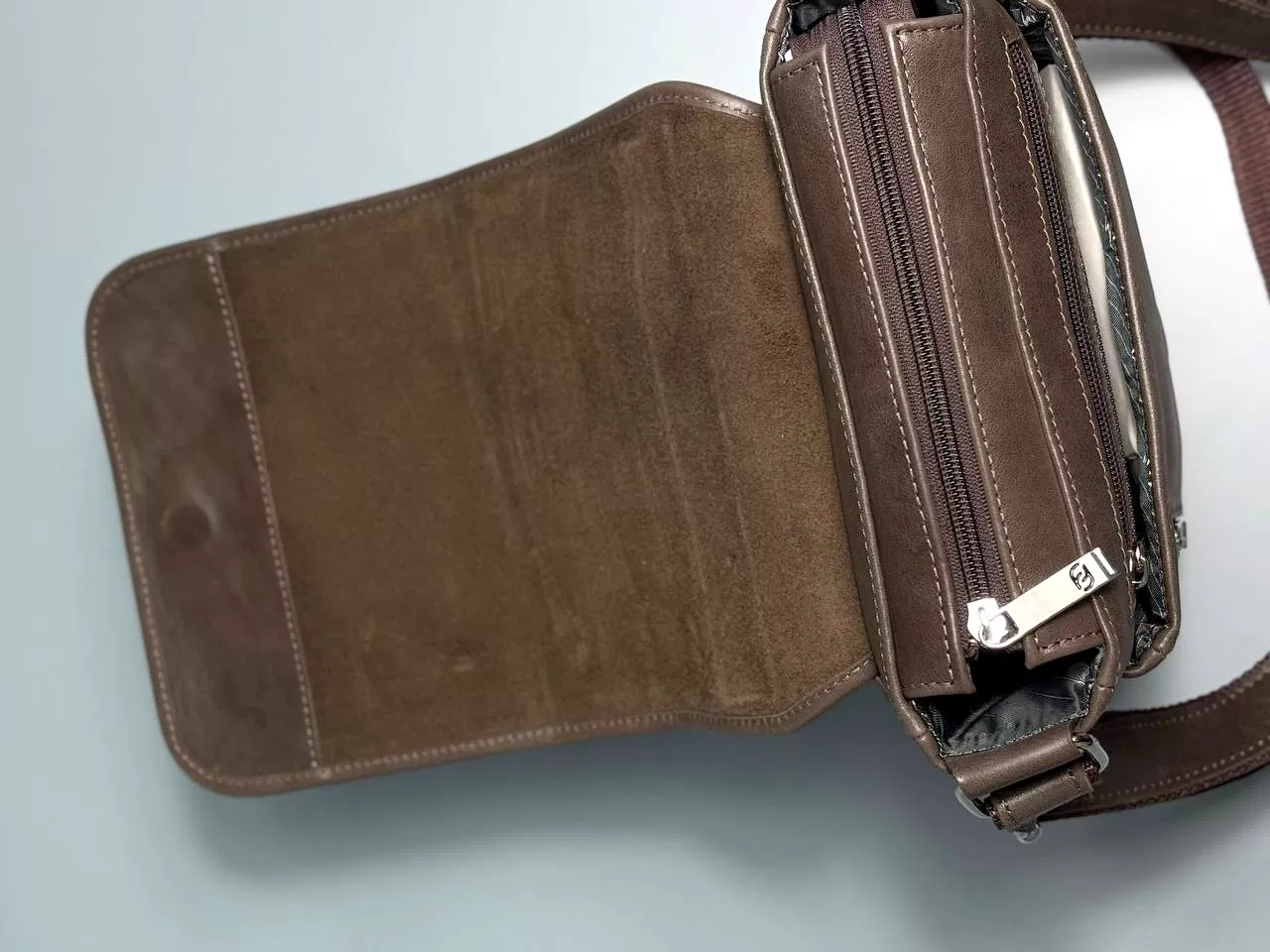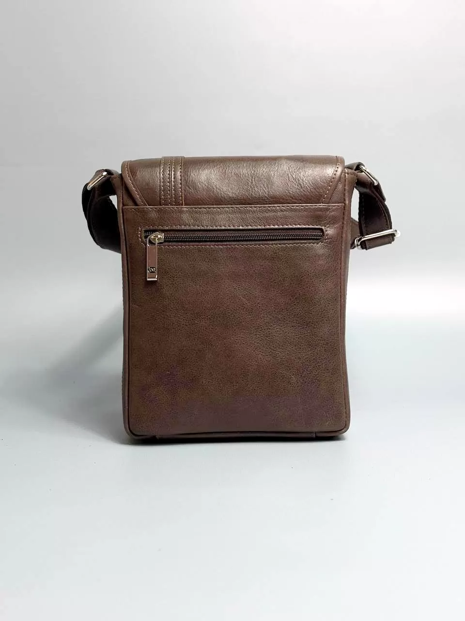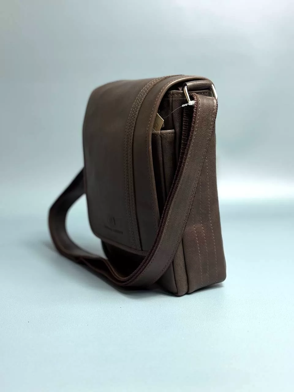 Модель с несъёмным плечевым ремнём коричневого цвета закрывается клапаном на магните. Под клапаном находится основное отделение на молнии. Внутри основного отделения есть фирменная подкладка, карман на молнии, два открытых маленьких кармана и средний карман.