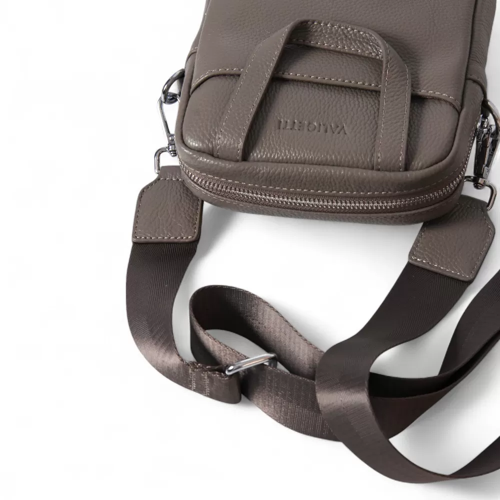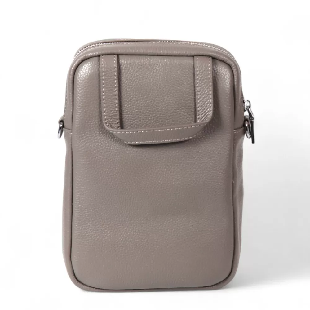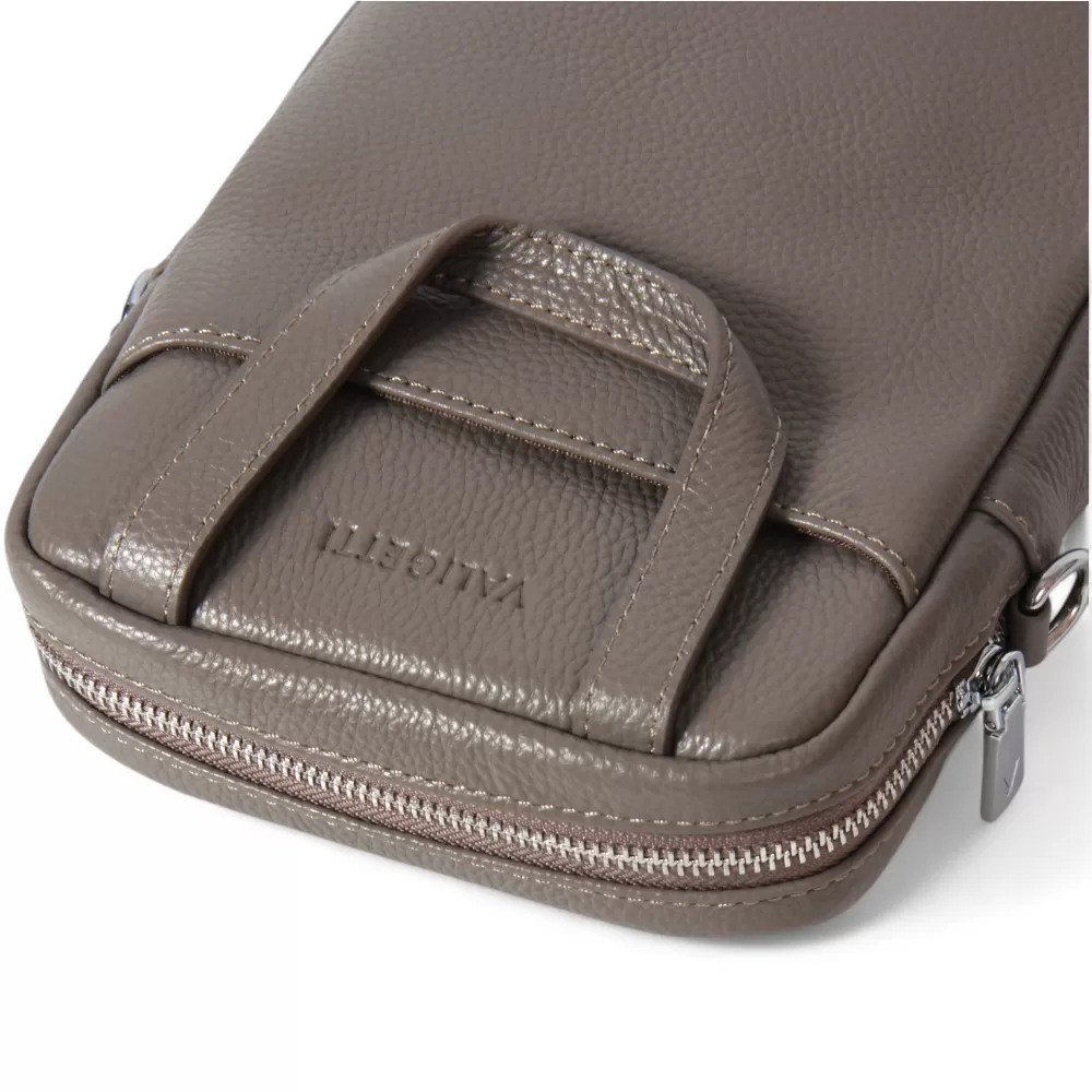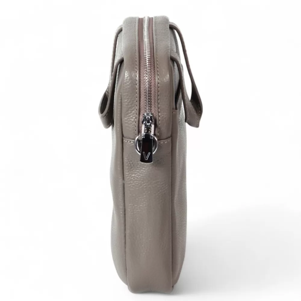 Сумка-планшет из натуральной кожи бренда Valigetti в сером цвете. Модель с двумя ручками и съемным регулируемым плечевым ремнем. На лицевой стороне расположен накладной карман, у сумки одно основное отделение на молнии, внутри пять накладных карманов, фирменная подкладка.