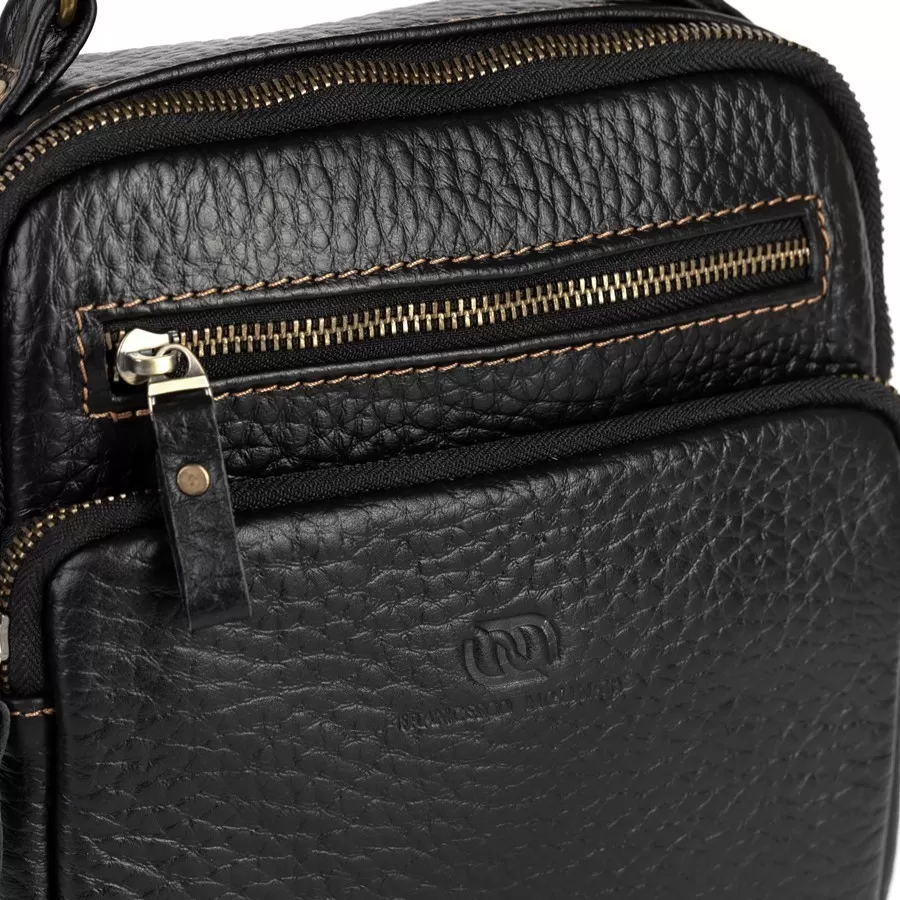 Стильный мужской планшет бренда Francesco Molinary из натуральной кожи черного цвета и рельефной структуры. Модель с одной ручкой на заклепках. Основное отделение на молнии, также имеет потайной карман. Внутри фирменная подкладка. Присутствуют 2 кармана лицевой стороне и 1 задний карман на молниях. В комплекте есть плечевой ремень