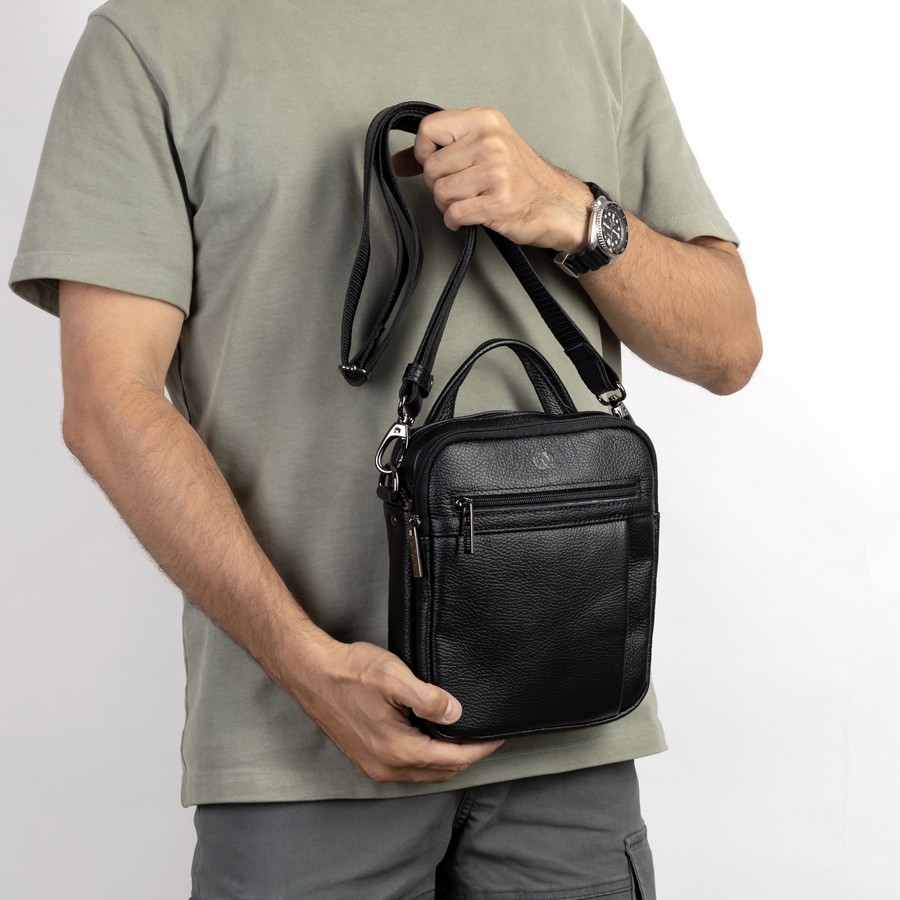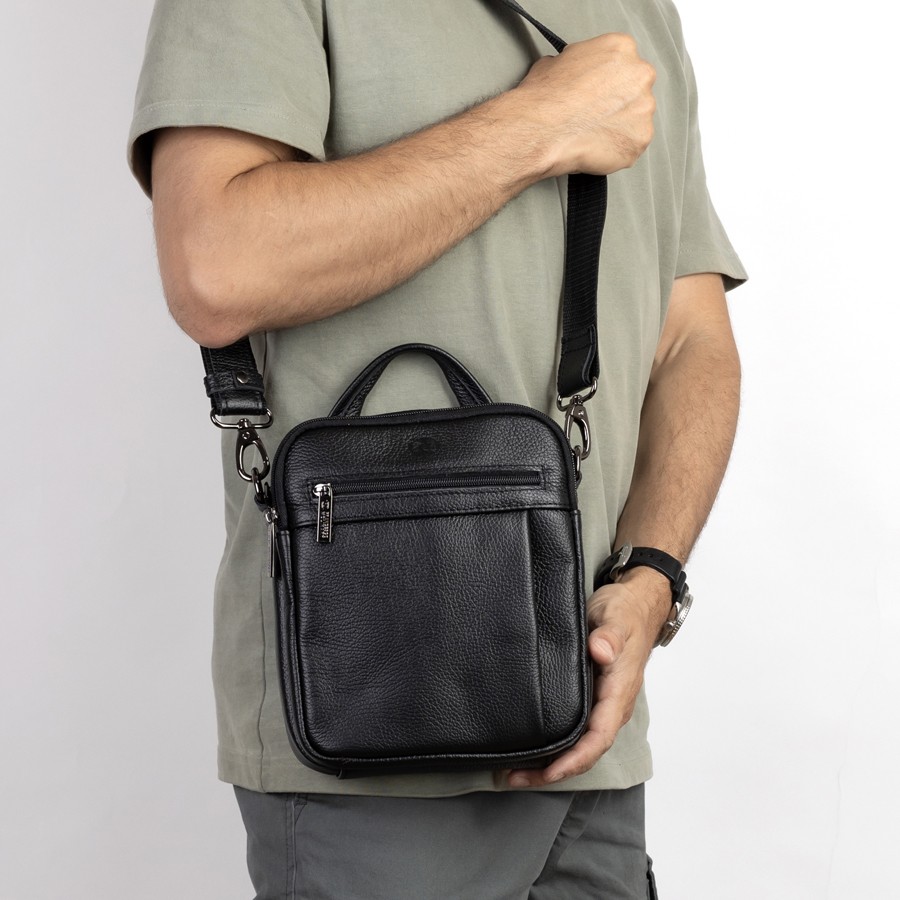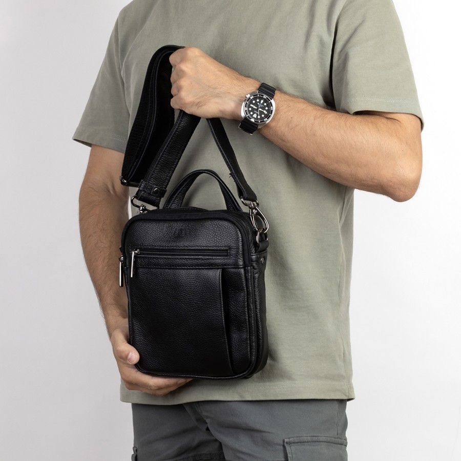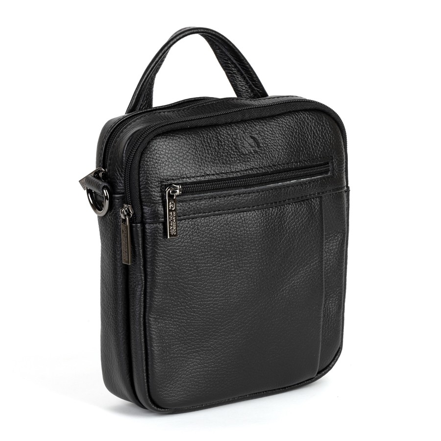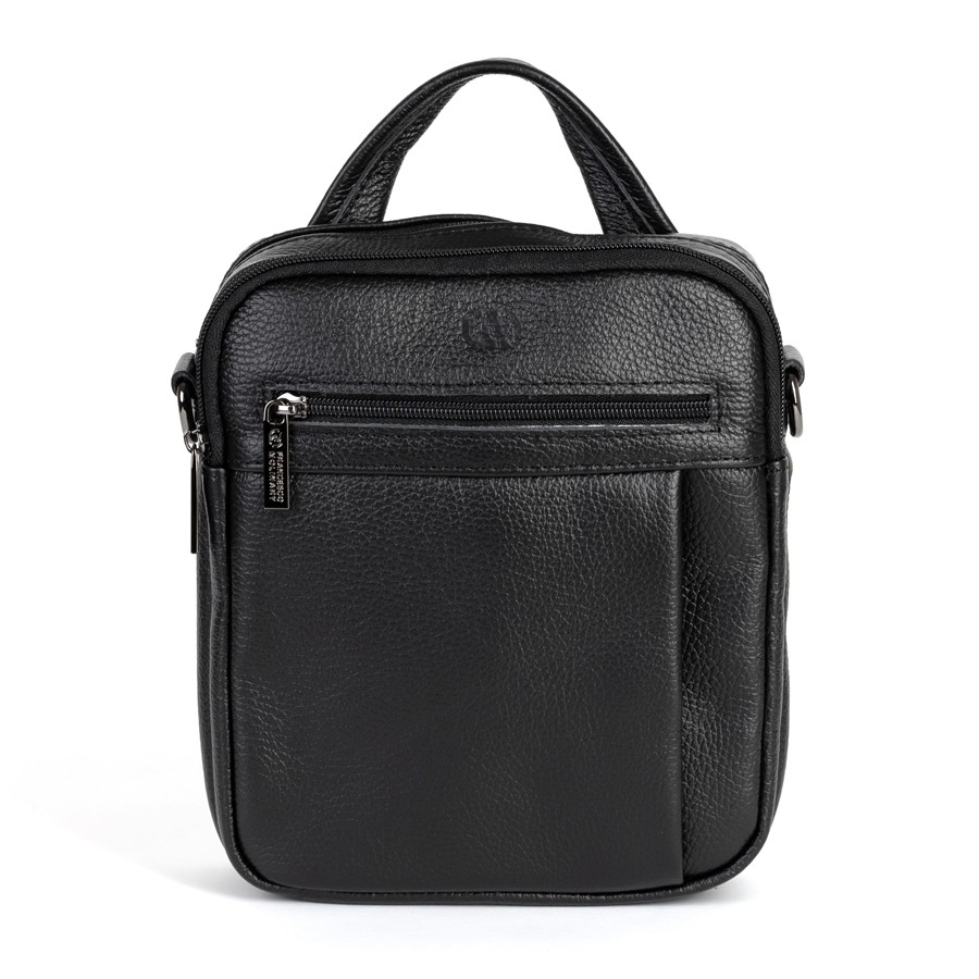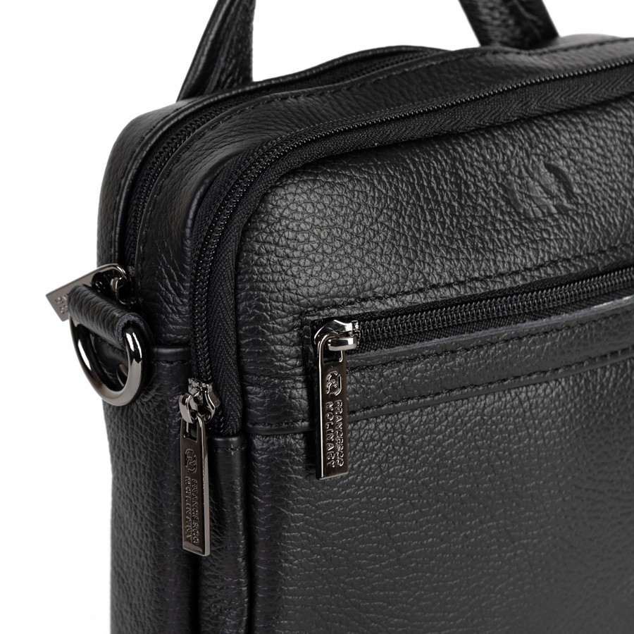 Стильный мужской планшет бренда Francesco Molinary из натуральной кожи черного цвета и рельефной структуры. Модель с пришитой одной ручкой. Основное отделение на молнии, также имеет потайной карман. Внутри фирменная подкладка. Присутствуют большой карман лицевой стороне с отделениями под мелкие вещи, малый карман и карман сзади на молниях. В комплекте есть плечевой ремень