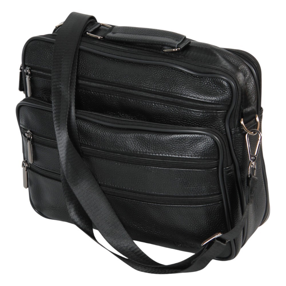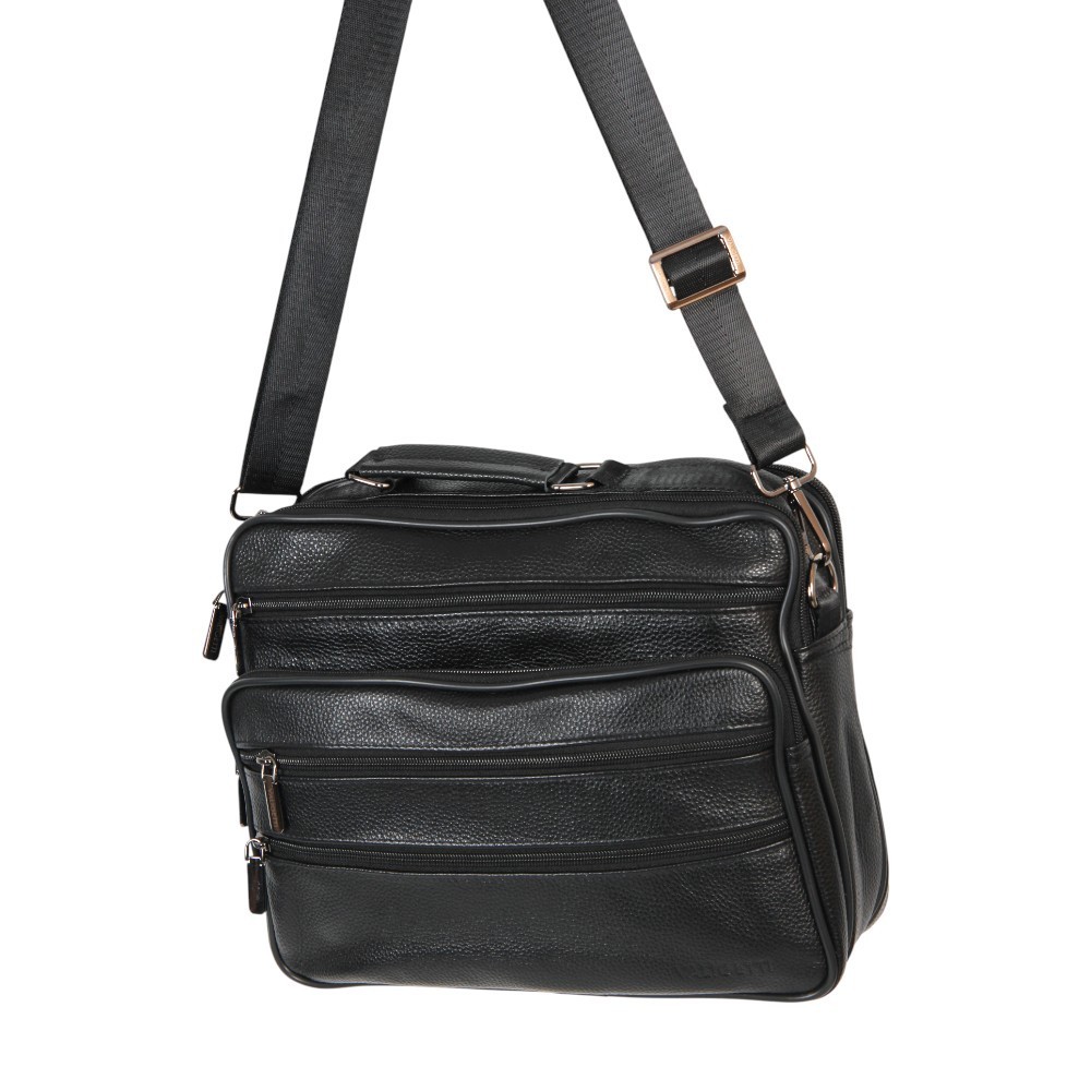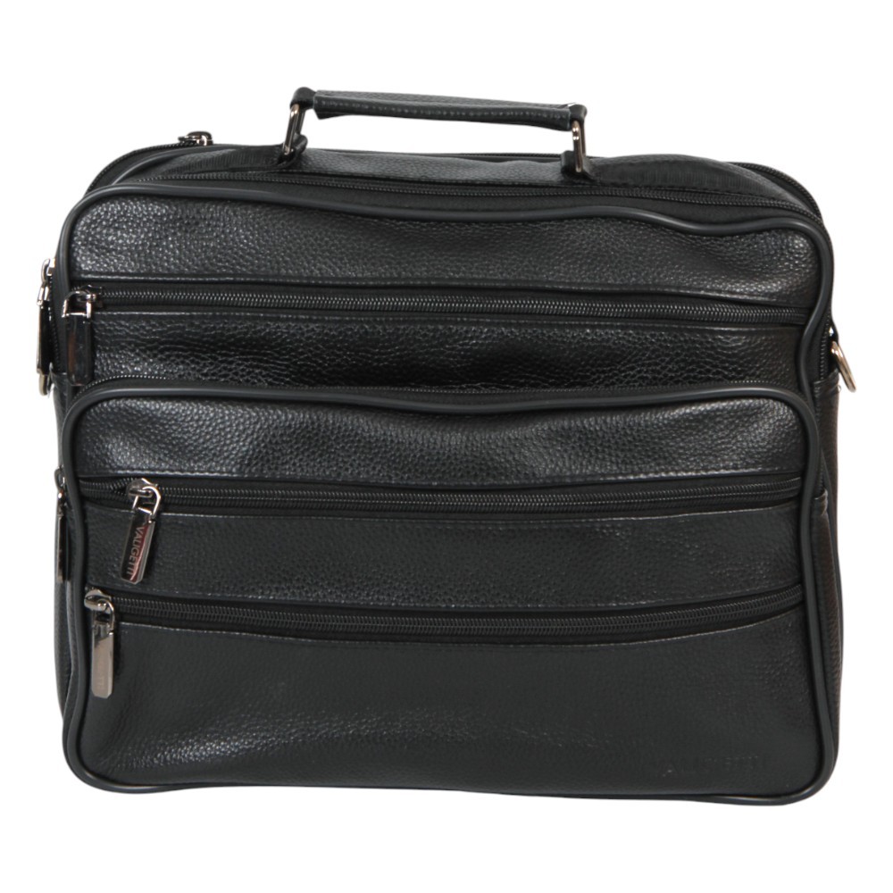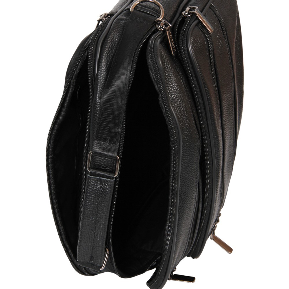 Сумка от бренда Valigetti выполнена из натуральной кожи черного цвета. Модель с ручкой и съемным регулируемым плечевым ремнем. Два отделения на молнии, внутри текстильная подкладка, карман на молнии, накладной карман. С лицевой стороны — четыре кармана на молнии. С задней стороны — карман на молнии.