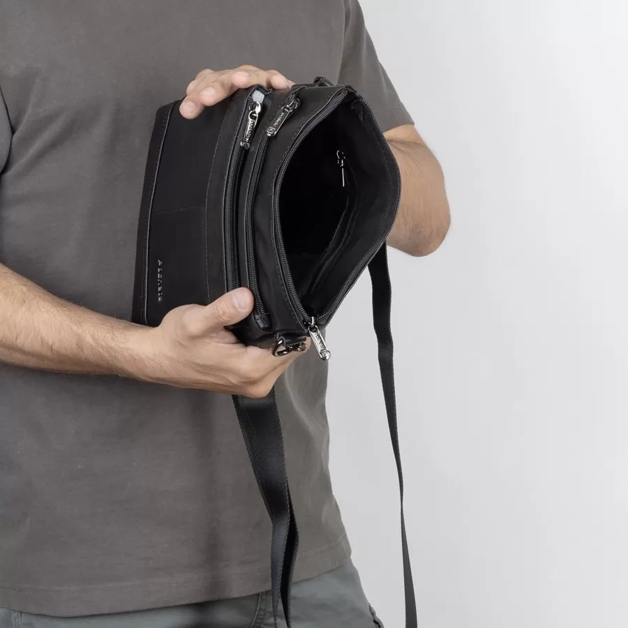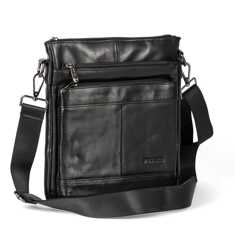 Сумка-планшет бренда Poshete из натуральной гладкой кожи черного цвета. Прошита фирменной подкладочной тканью. Имеет текстильные плечевой ремень. Внутри основного отделения под молнией карман на молнии и 2 кармашка для мелких вещей. На лицевой стороне имеются дополнительное отделение под молнией и карман на молнии. На задней стороне есть карман на молнии