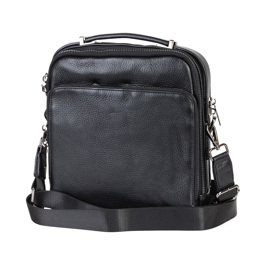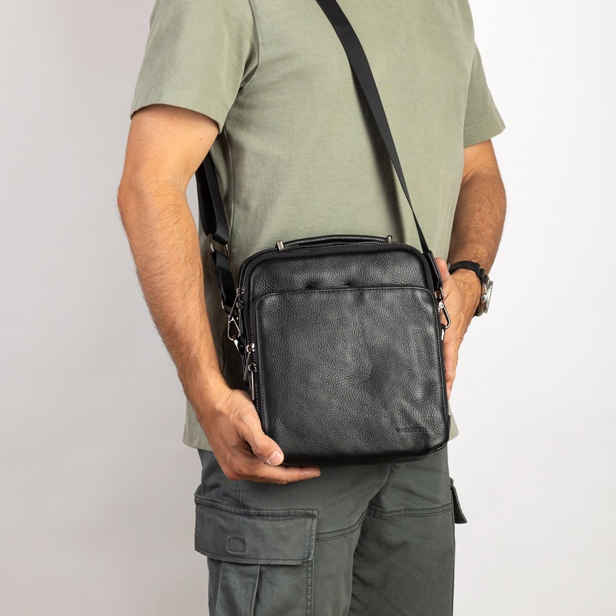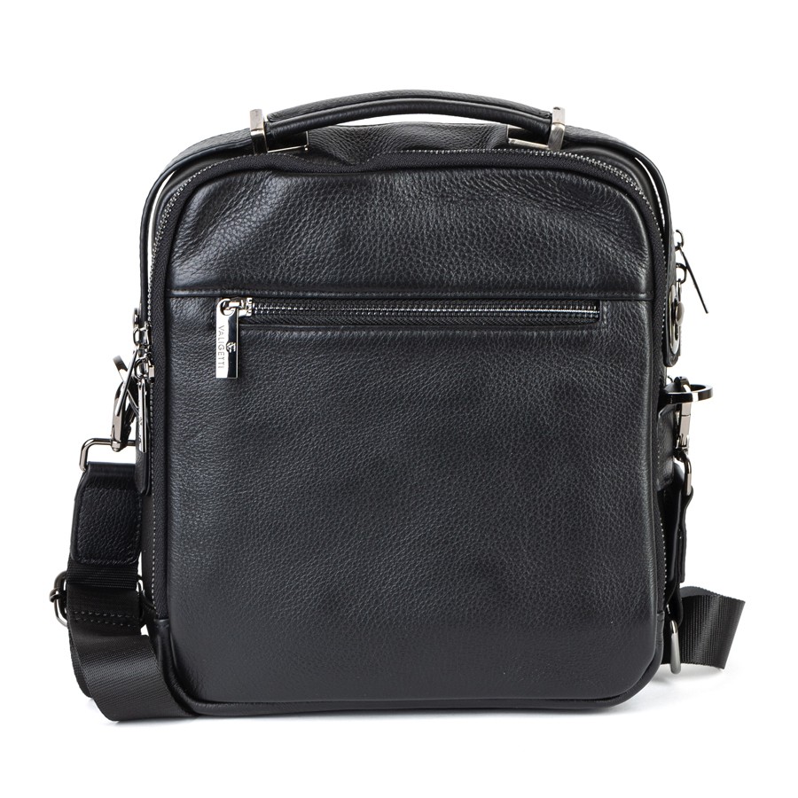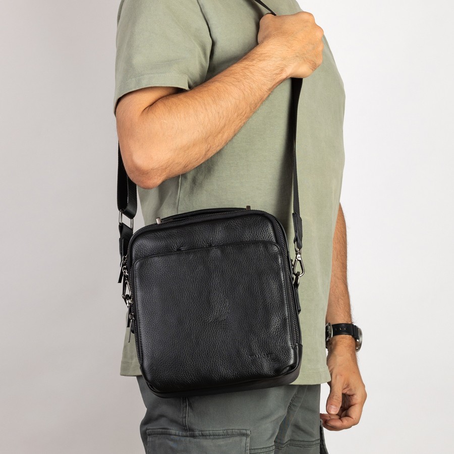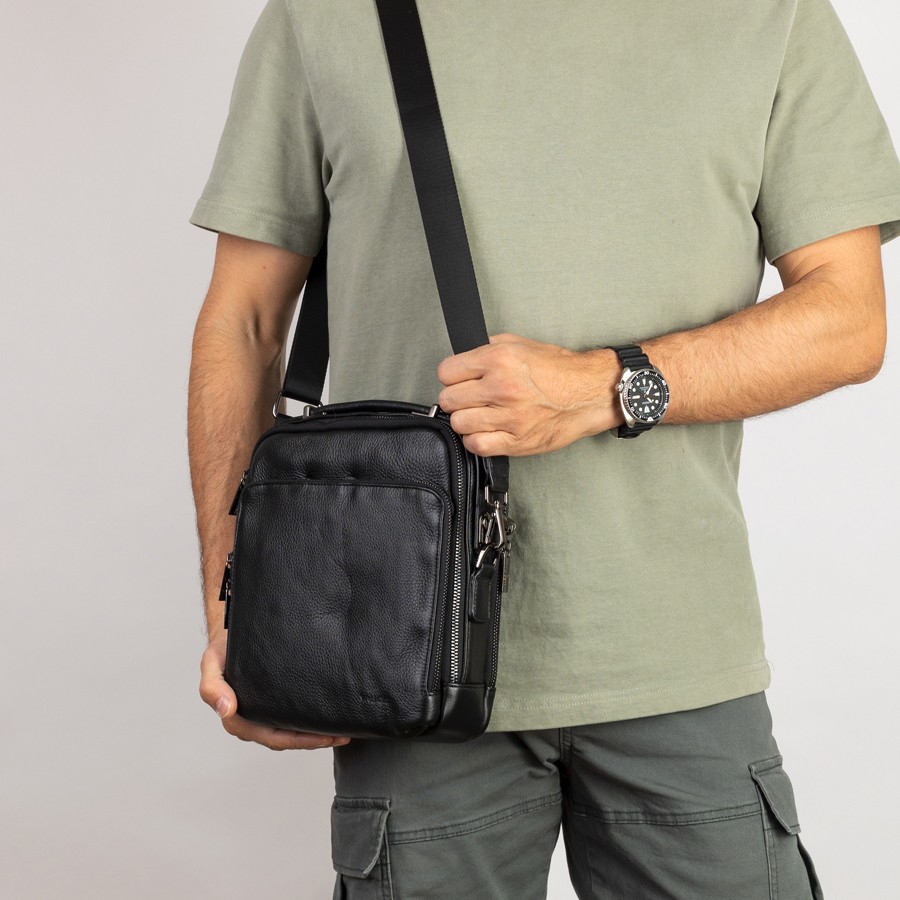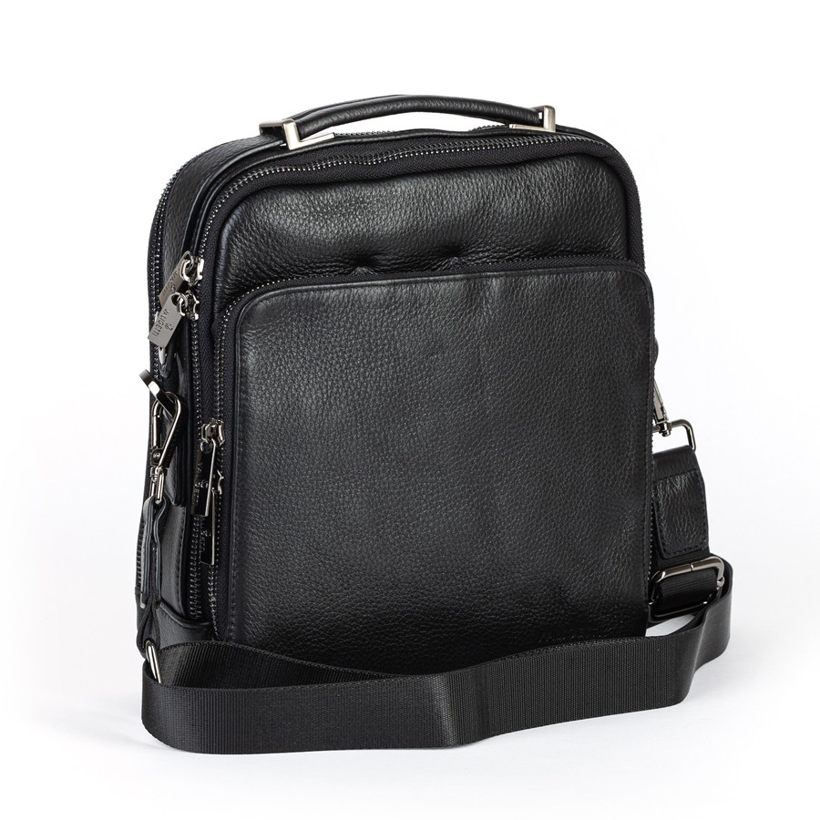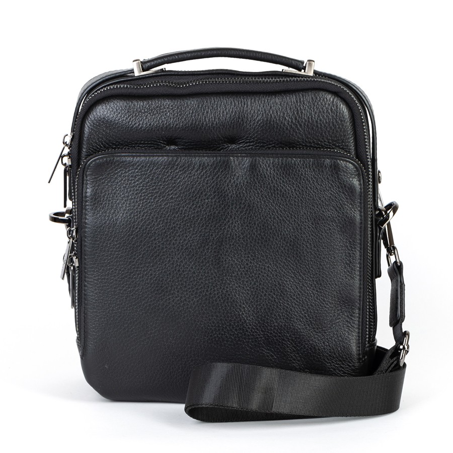 Сумка-планшет от торговой марки Valigetti из натуральной кожи черного цвета. Модель со съемным регулируемым плечевым ремнем, выполненным из текстильного материала. Два отделения на молнии. Внутри: текстильная подкладка, накладной карман. На лицевой и спинке – два кармана на молнии.