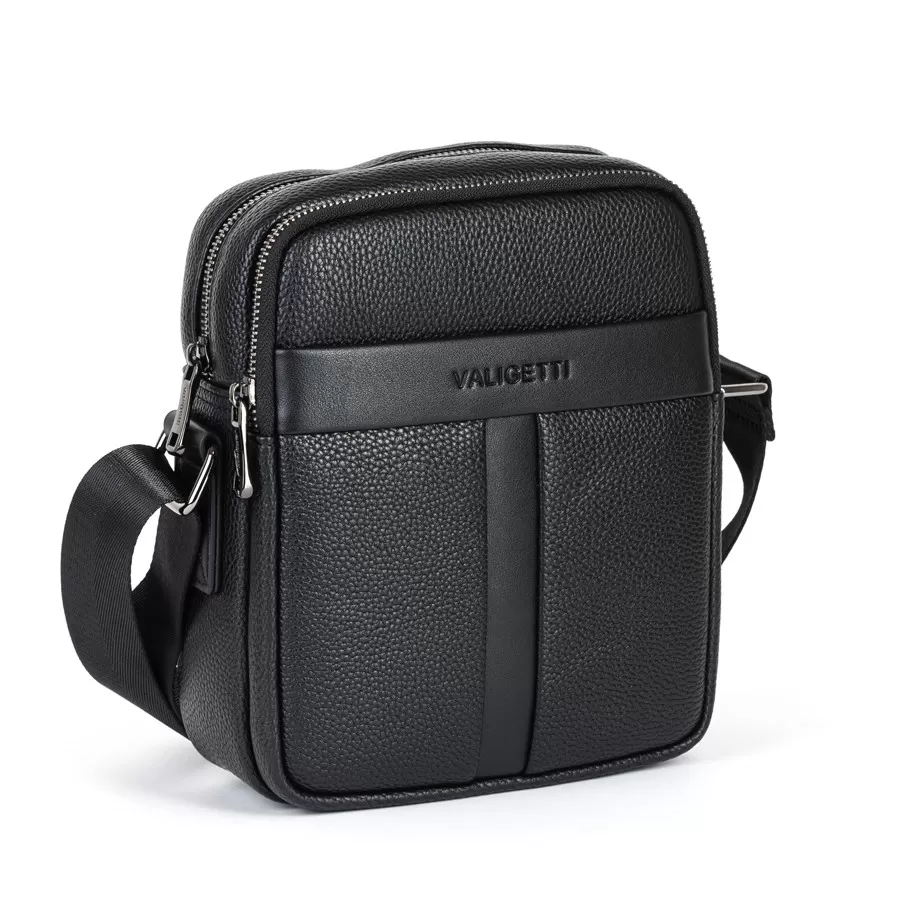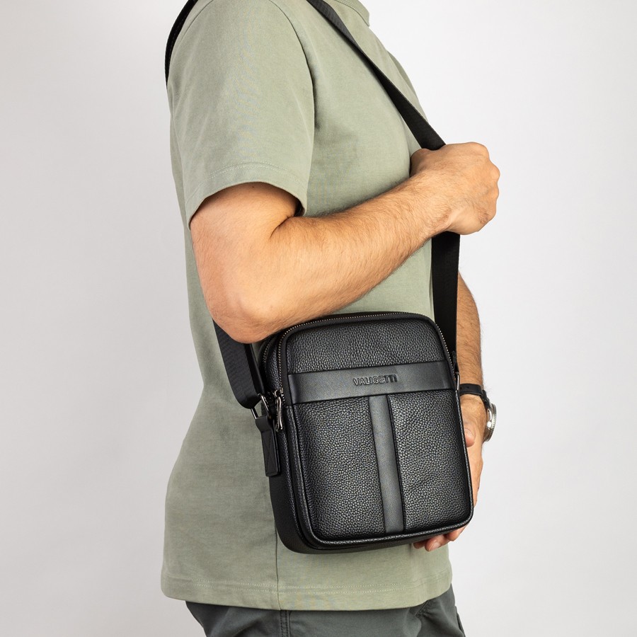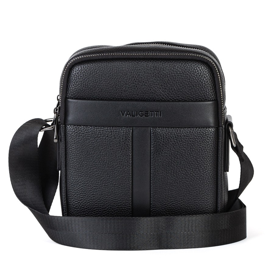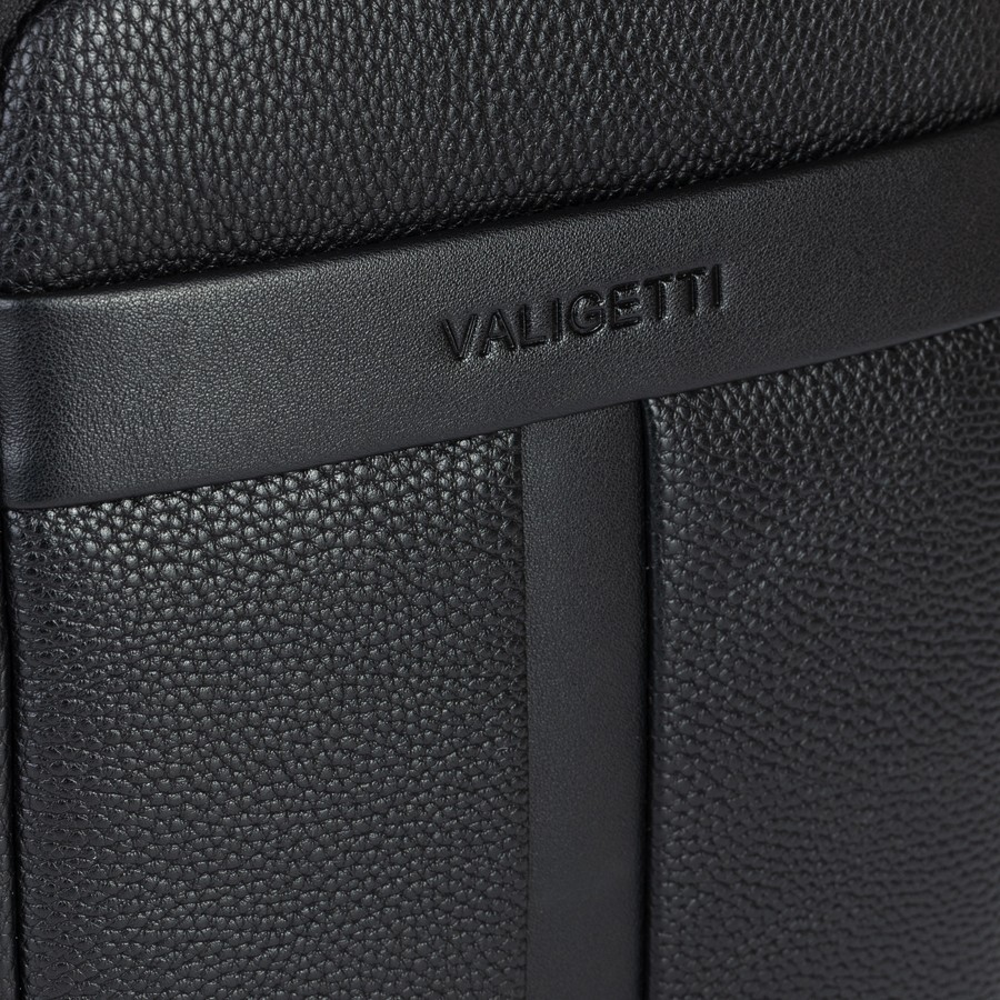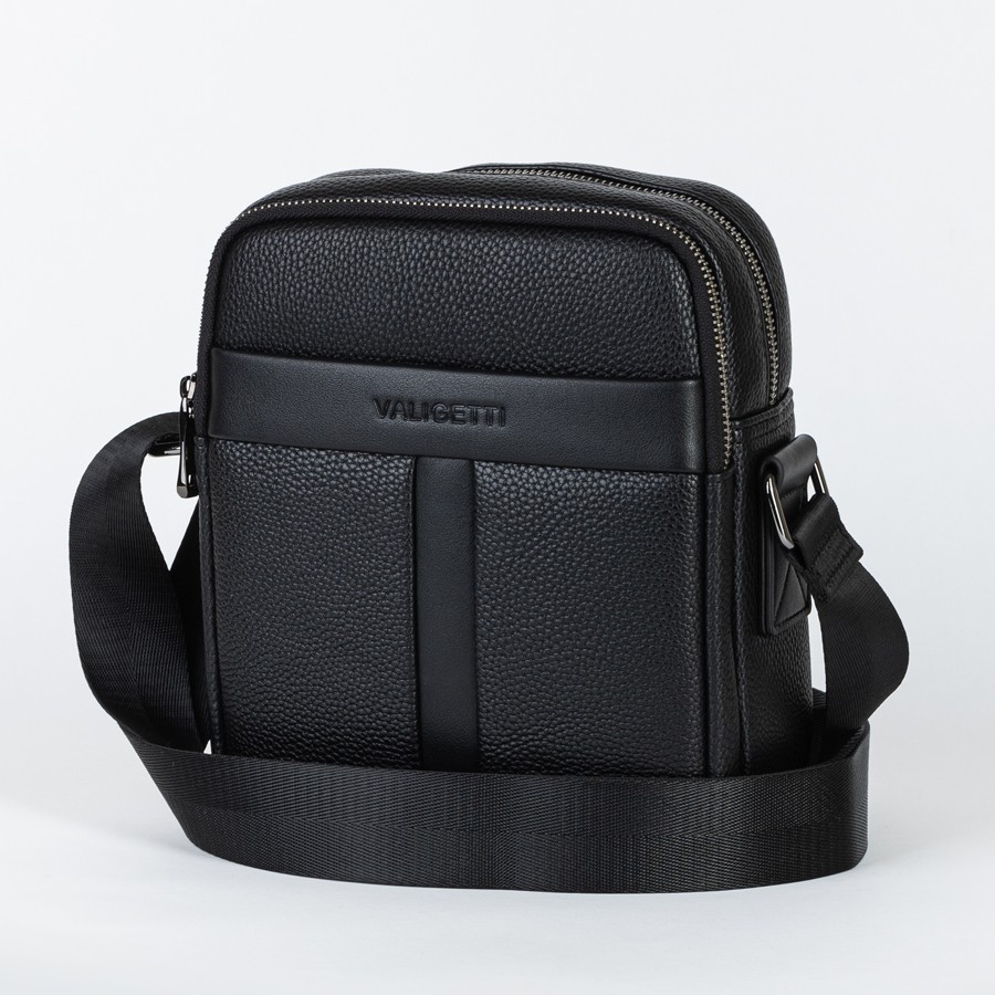 Мужская сумка-планшет бренда Valigetti из искусственной кожи черного цвета зернистой структуры. Прошита фирменной подкладочной тканью. Имеет регулируемый текстильный плечевой ремень. Внутри основного отделения под молнией карман на молнии и кармашек для мелких вещей. На лицевой стороне имеются дополнительное отделение под молнией. На задней стороне есть карман на молнии