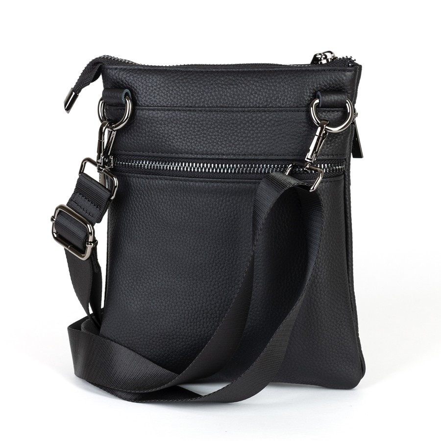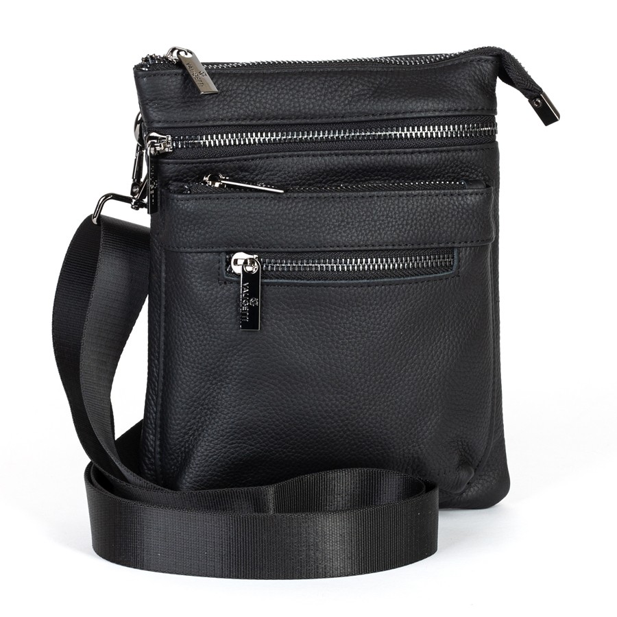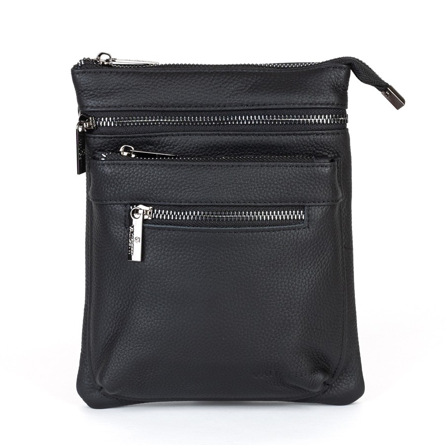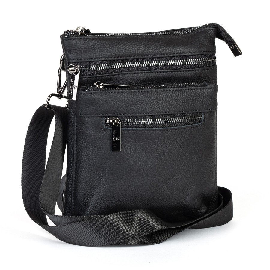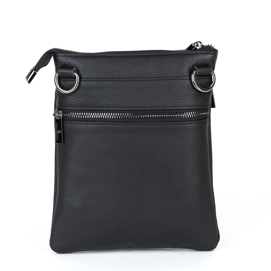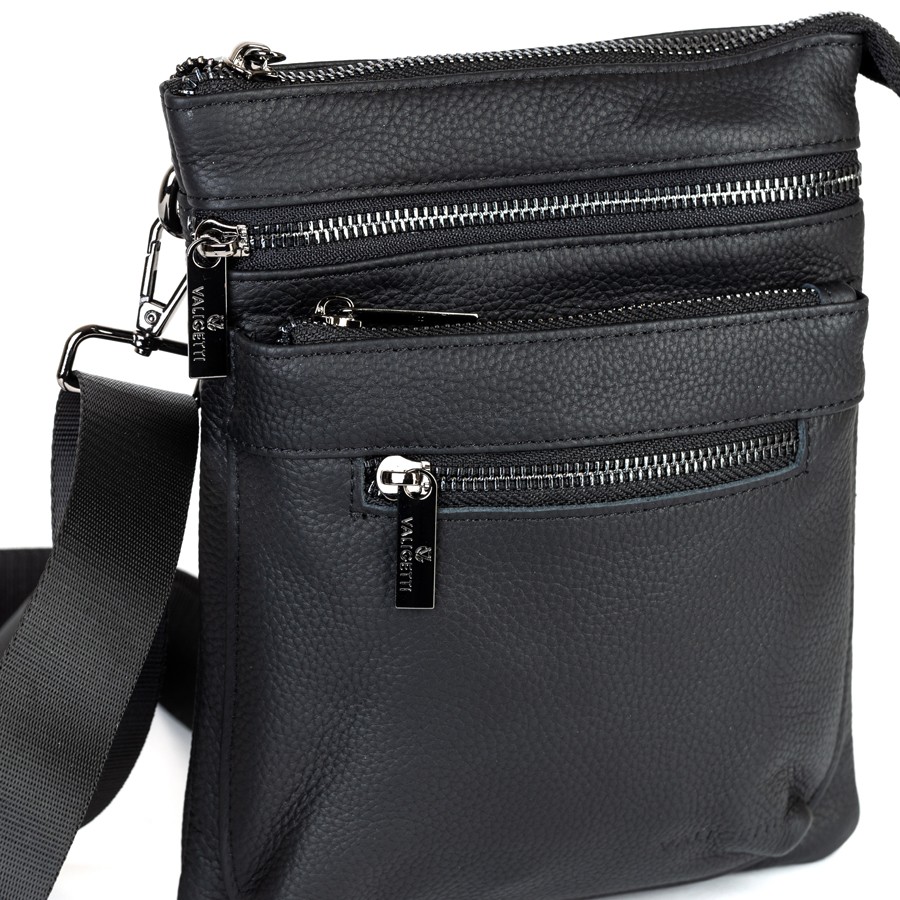 Сумка-планшет от торговой марки Valigetti из натуральной кожи черного цвета. Модель со съемным регулируемым плечевым ремнем, выполненным из текстильного материала. Отделение на молнии. Внутри: текстильная подкладка, карман на молнии. На лицевой стороне – три кармана на молнии. На задней стороне – карман на молнии.