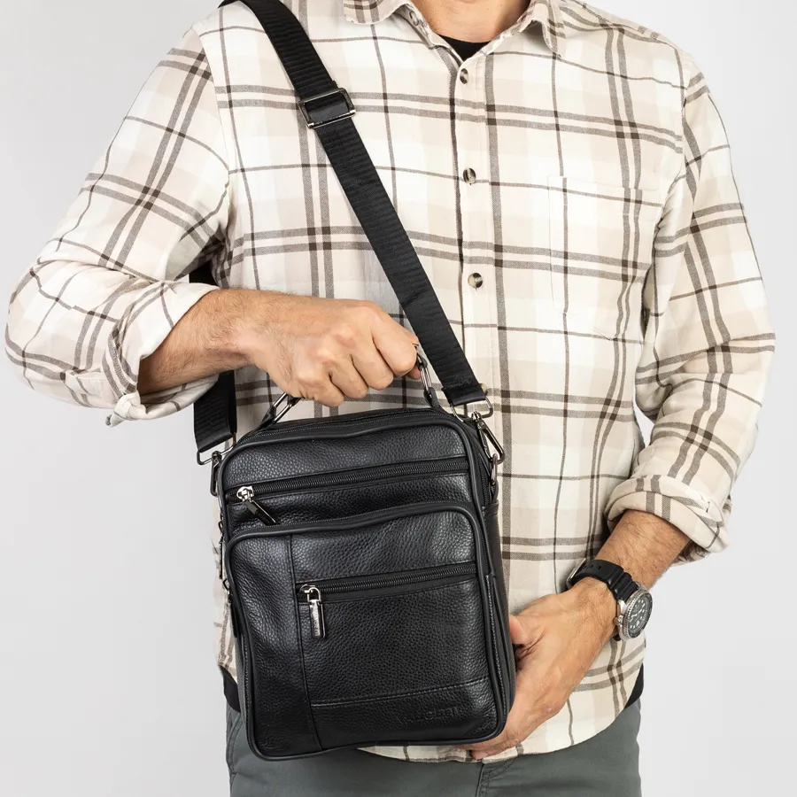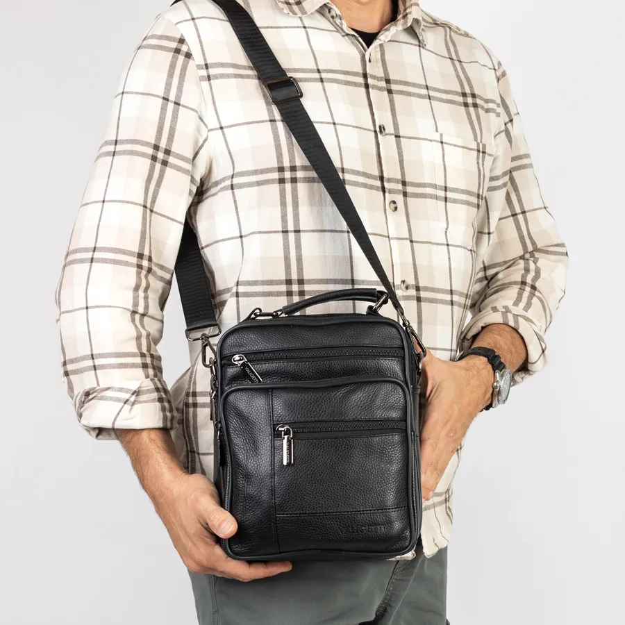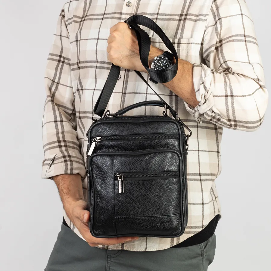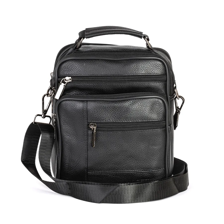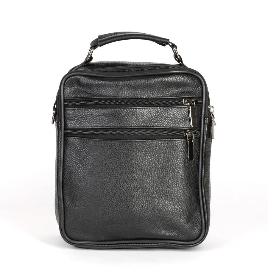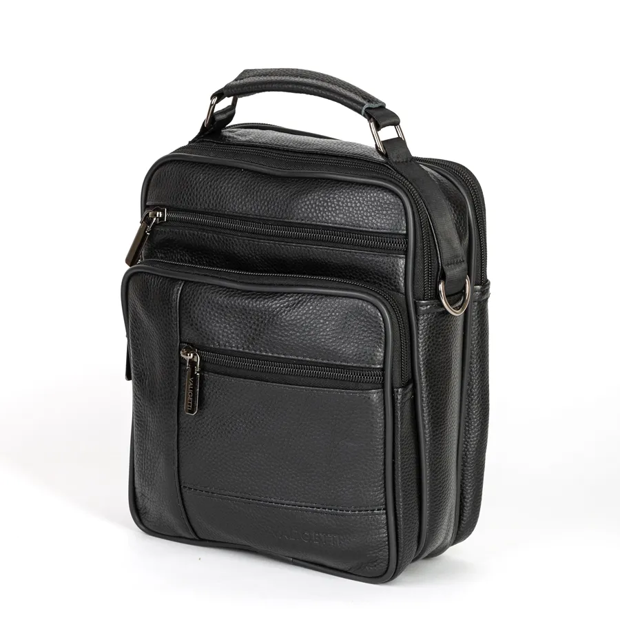 Сумка от торговой марки Valigetti выполнена из натуральной кожи черного цвета. Модель с ручкой для переноски и длинным регулируемым плечевым ремнем. Два отделения на молнии. С лицевой стороны - три кармана на молнии. С задней стороны - два кармана на молнии.