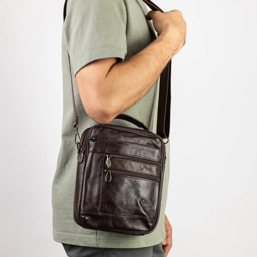 Сумка-планшет от бренда Valigetti выполнена из натуральной кожи коричневого цвета зернистой структуры. Модель оснащена широким съемным регулируемым плечевым ремнем из текстиля. Также вшитая ручка. Внутри: 2 отделения и внутренний карман на молнии. На передней стороне 3 кармана на молнии. На задней — карман на молнии