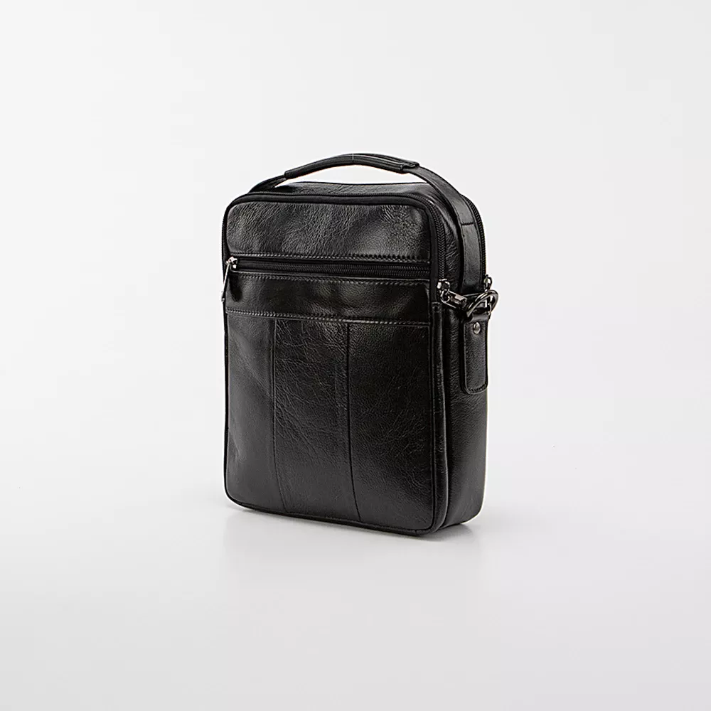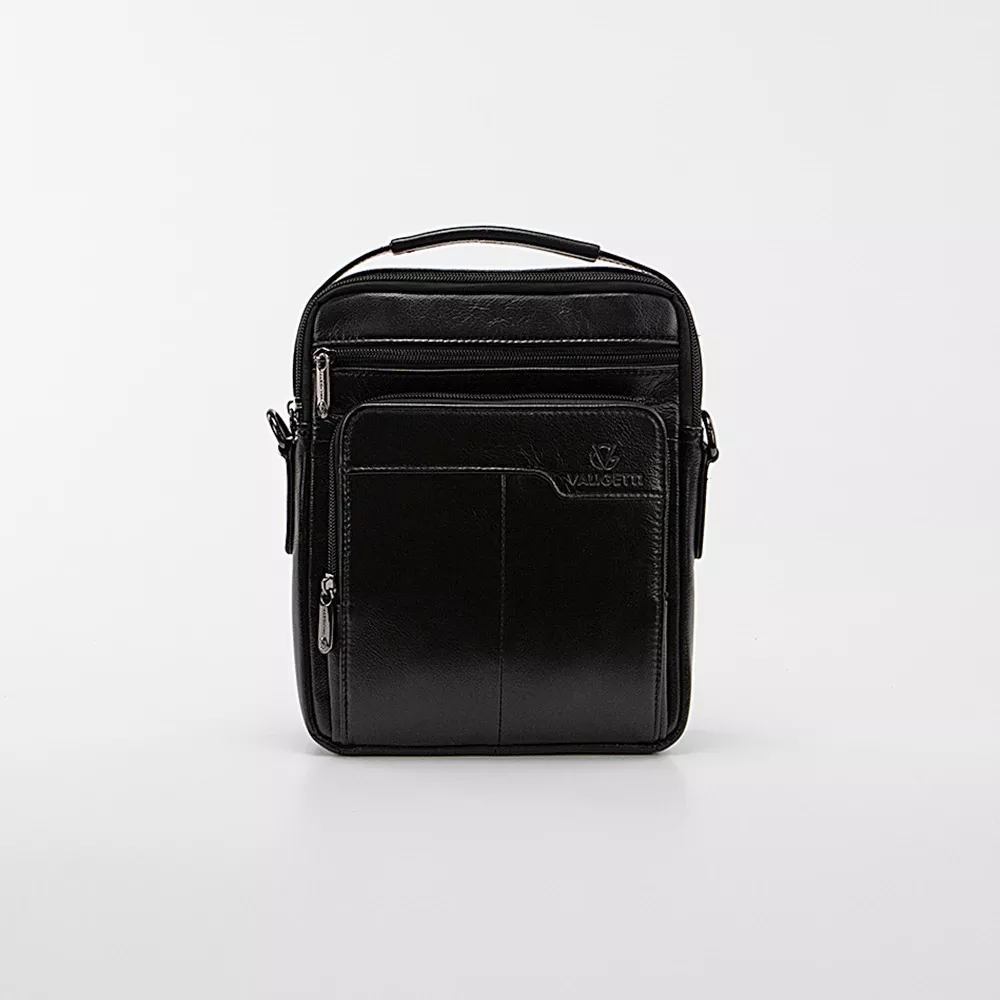 Сумка от бренда Valigetti из натуральной кожи черного цвета. Модель с одной ручкой и съемным регулируемым плечевым ремнем, выполненным из текстильного материала. Два отделения на молнии, с фирменной подкладкой. В заднем отделении – карман на молнии. На лицевой стороне – два кармана на молнии. На задней стороне – карман на молнии.
