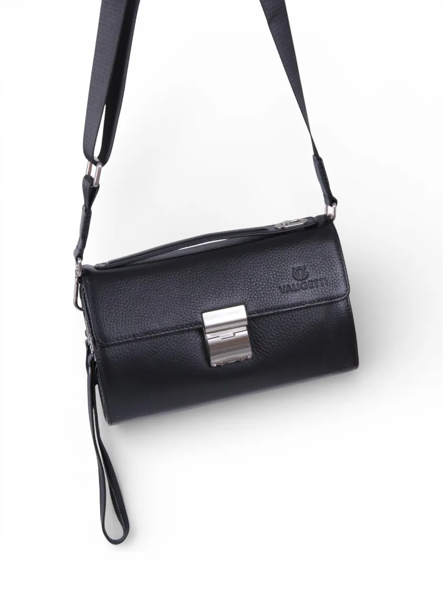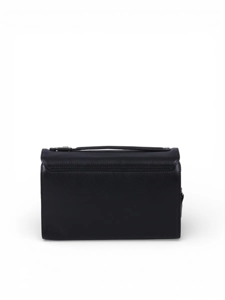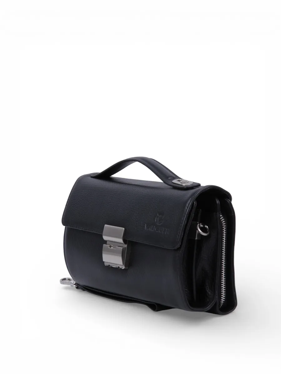 Барсетка от бренда Valigetti выполнена из натуральной кожи в черном цвете. Модель оснащена ручкой для переноски, дополнительной ручкой на клапане и съемным плечевым ремнем с регулировкой длины. Внутри есть два отделения, закрытые клапаном с кодовым замком. В одном отделении предусмотрены места для мелочей, средний карман на молнии, а также два боковых накладных кармана без застежек. Второе отделение, закрытое на молнию, можно использовать как кошелек для хранения документов, кредитных карт, монет и купюр.