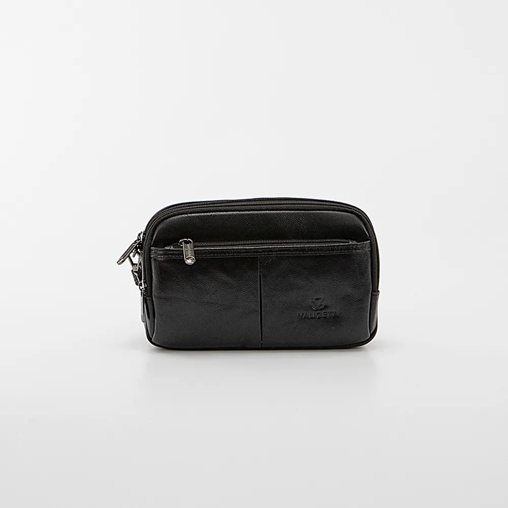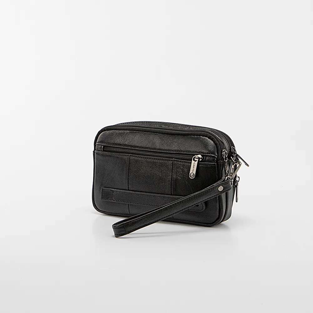 Сумка-барсетка от торговой марки Valigetti из натуральной кожи черного цвета. Модель со съемным ремешком для запястья, ремешком для ношения на ладони. Три отделения на молнии, с фирменной подкладкой. В заднем отделении – карман на молнии. На лицевой и задней сторонах – карман на молнии.